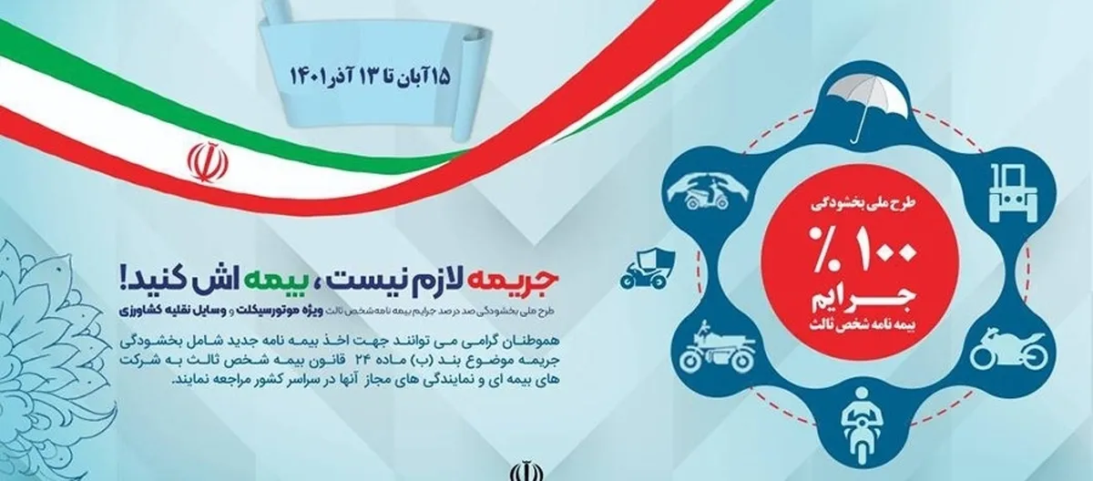 صد درصد جرایم بیمه شخص ثالث ویژه موتور سیکلت و وسایل نقلیه کشاورزی، بخشیده میشود.
