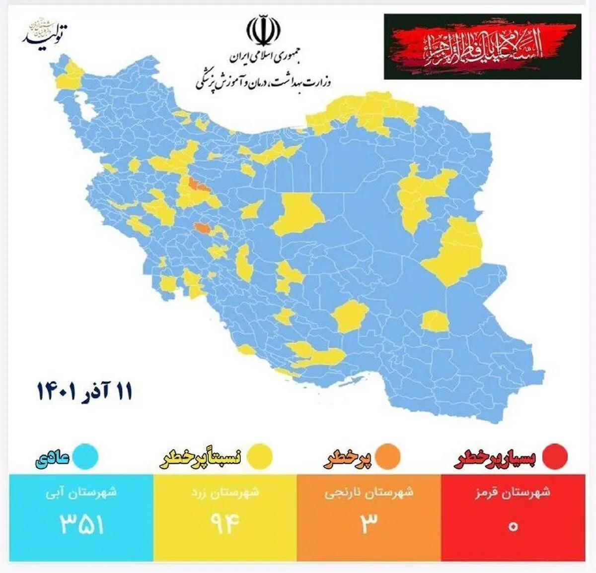 وزارت بهداشت، درمان و آموزش پزشکی اعلام کرد: براساس آخرین به روز رسانی، تعداد شهرهای با وضعیت قرمز همانند هفتههای گذشته صفر بوده و تعداد شهرهای با وضعیت آبی از ۳۳۱ به ۳۵۱ شهر افزایش یافته است.