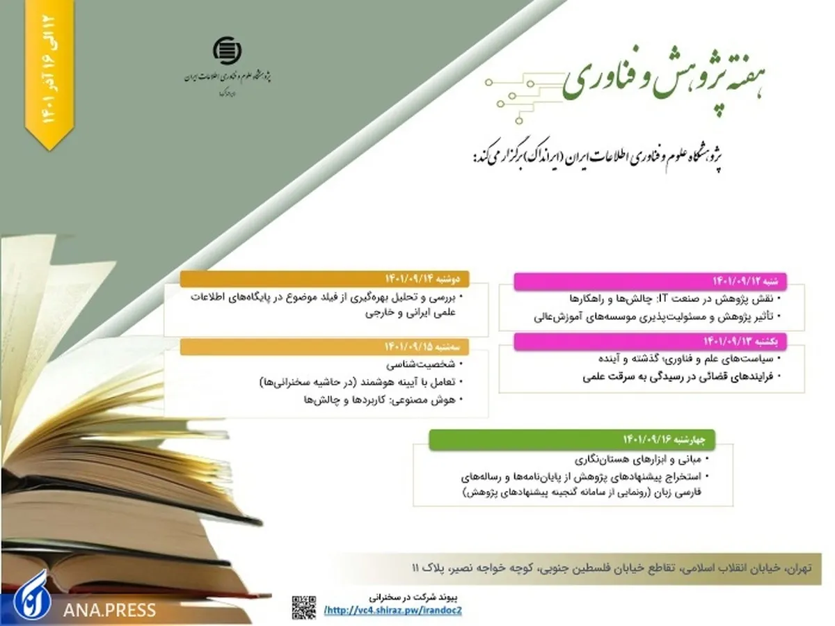 به گزارش گروه آموزش و پژوهش خبرگزاری آنا، ۱۰ نشست و پنل تخصصی با عناوین «نقش پژوهش در صنعت IT: چالشها و راهکارها»، با سخنرانی محمد ربیعی، حمیدرضا آموزگار، و وحید حاجیپور، «تاثیر پژوهش و مسئولیتپذیری موسسههای آموزش عالی»، با سخنرانی بهروز رسولی، «سیاستهای علم و فناوری؛ گذشته و آینده»، با سخنرانی رضا حسان، «فرایندهای قضائی در رسیدگی به سرقت علمی»، با سخنرانی صفر بیگزاده، «بررسی و تحلیل بهرهگیری از فیلد موضوع در پایگاههای اطلاعات علمی ایرانی و خارجی»، با سخنرانی فریبرز درودی، «شخصیتشناسی»، با سخنرانی سیدمهدی سمائی، «تعامل با آیینه هوشمند»، با ارائه آزاده محبی، «هوش مصنوعی: کاربردها و چالشها»، با سخنرانی امیرحسین صدیقی، «مبانی و ابزارهای هستاننگاری»، با سخنرانی ملوکالسادات حسینی بهشتی، و «استخراج پیشنهادهای پژوهش از پایاننامهها و رسالههای فارسیزبان» با سخنرانی نصراله پاکنیت در هفته پژوهش برگزار میشود.