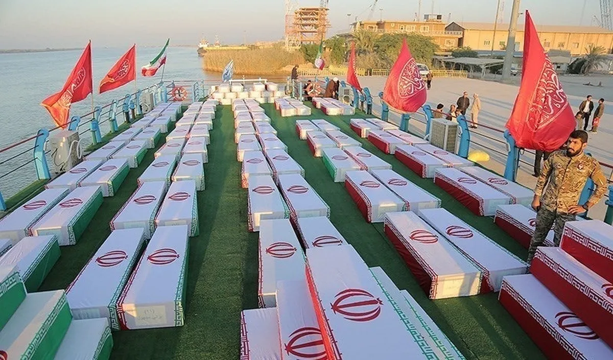 پیکر پاک ۱۱۱ شهید دوران دفاع مقدس روز پنجشنبه از طریق آبراهه بین المللی اروند رود وارد اسکله آبادان شدند.