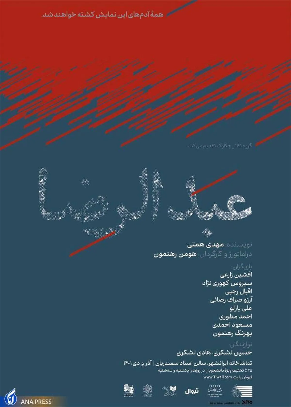 به گزارش گروه فرهنگ خبرگزاری آنا، نمایش «عبدالرضا» به کارگردانی هومن رهنمون با بازی افشین زارعی، سیروس کهوری نژاد، محمداقبال رجبی، آرزو صرّاف رضائی، علی یارلو، احمد مطوری، مسعود احمدی، بهرنگ رهنمون از روز پنجشنبه ۲۴ آذر ماه ساعت ۸ شب در سالن استاد سمندریان این تماشاخانه اجراهای خود را آغاز میکند.