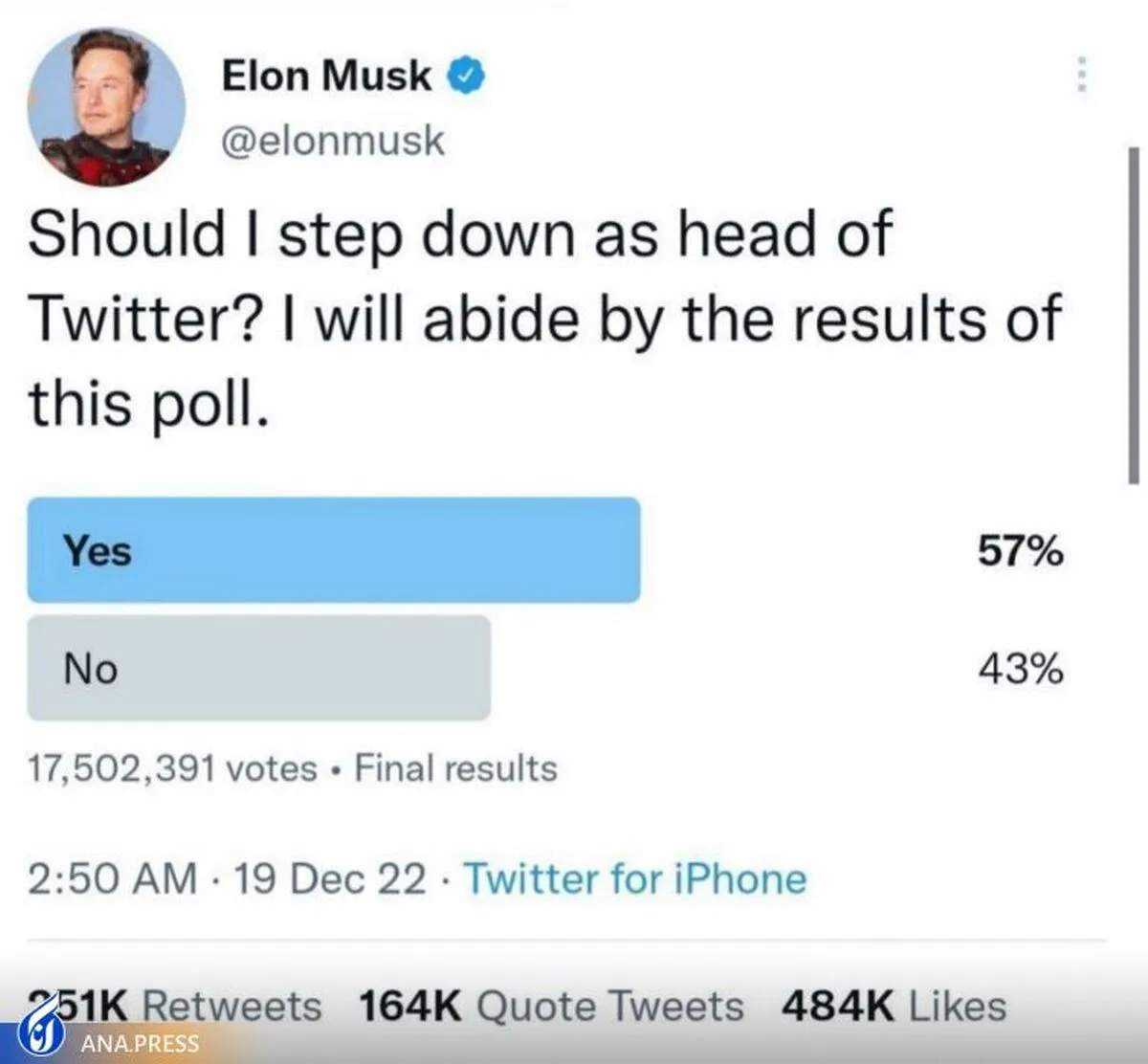 به گزارش گروه دانش و فناوری خبرگزاری آنا، ایلان ماسک دیروز در یک نظرسنجی از کاربران صفحه خود پرسیده بود که از ریاست توییتر کنارهگیری کند یا خیر؟
