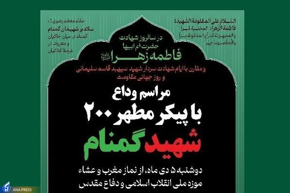 به گزارش گروه فرهنگ خبرگزاری آنا، مراسم وداع با پیکر پاک و مطهر ۲۰۰ شهید گمنام دوران دفاع مقدس همزمان با شب شهادت حضرت فاطمه (س) و مقارن با ایام شهادت سپهبد شهید حاج قاسم سلیمانی و روز جهانی مقاومت با حضور مقامات لشکری و کشوری و عاشقان شهدا در موزه ملی انقلاب اسلامی و دفاع مقدس برگزار میشود.