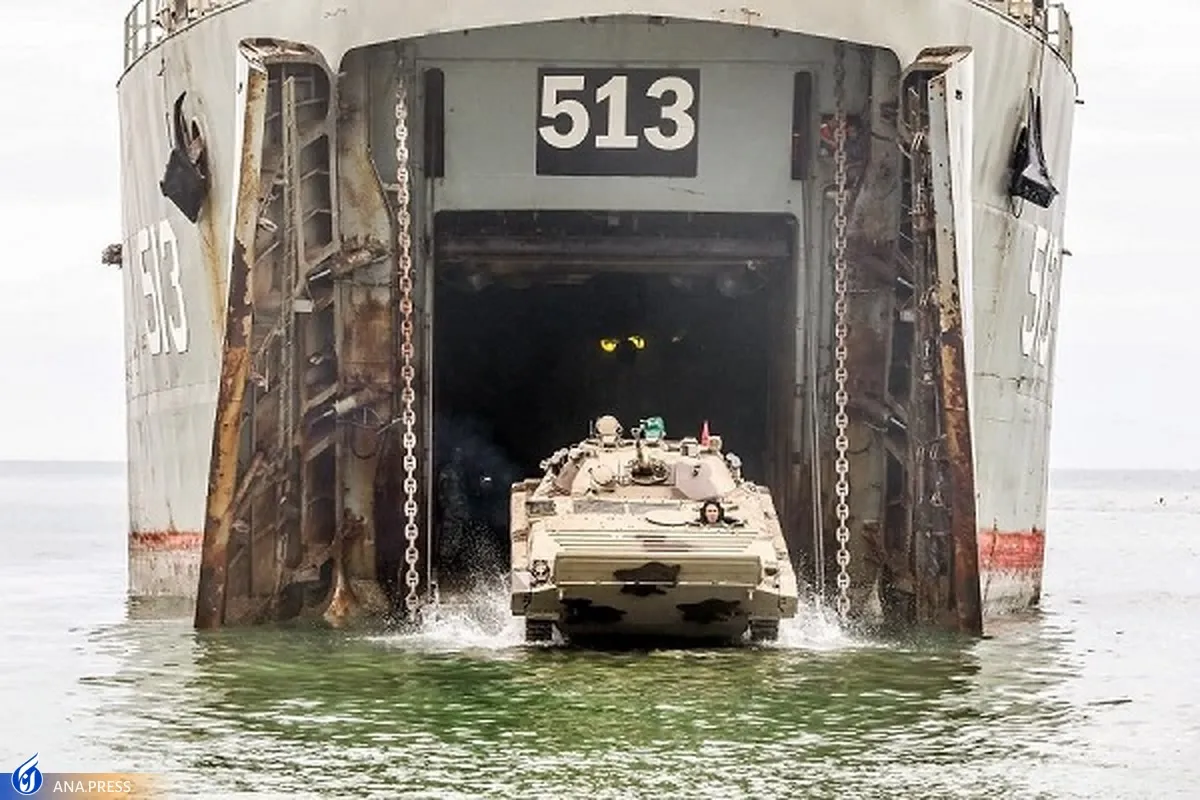 به گزارش گروه سیاست خبرگزاری آنا، در ادامه مراحل اصلی این رزمایش و در یک عملیات مشترکی نیروی دریایی و نیروی زمینی، یک فروند ناو آب خاکی تنب، تانکهای T-72 و نفربرهای BMP-2 را برای اجرای عملیات بیچینگ یا تصرف سرپل از دریا به ساحل دشمن منتقل کرد.