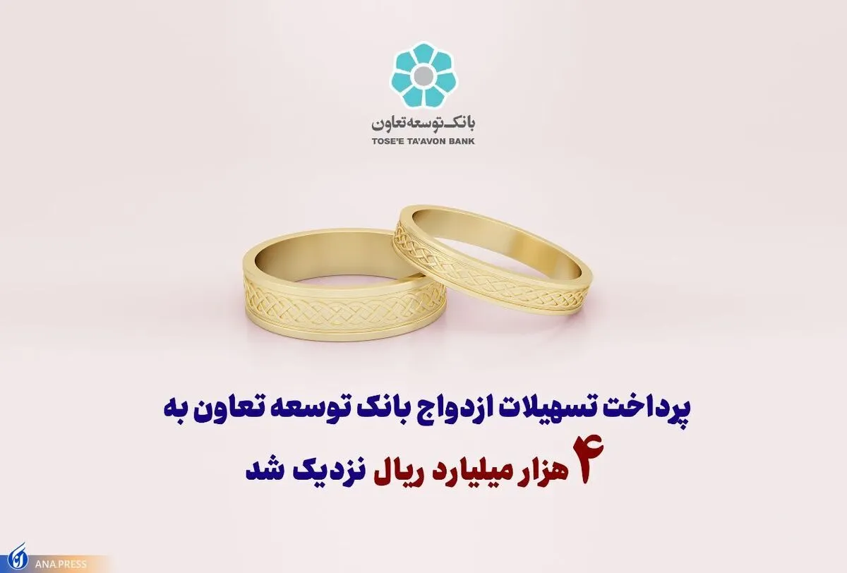 پرداخت تسهیلات ازدواج بانک توسعه تعاون به ۴ هزار میلیارد ریال نزدیک شد