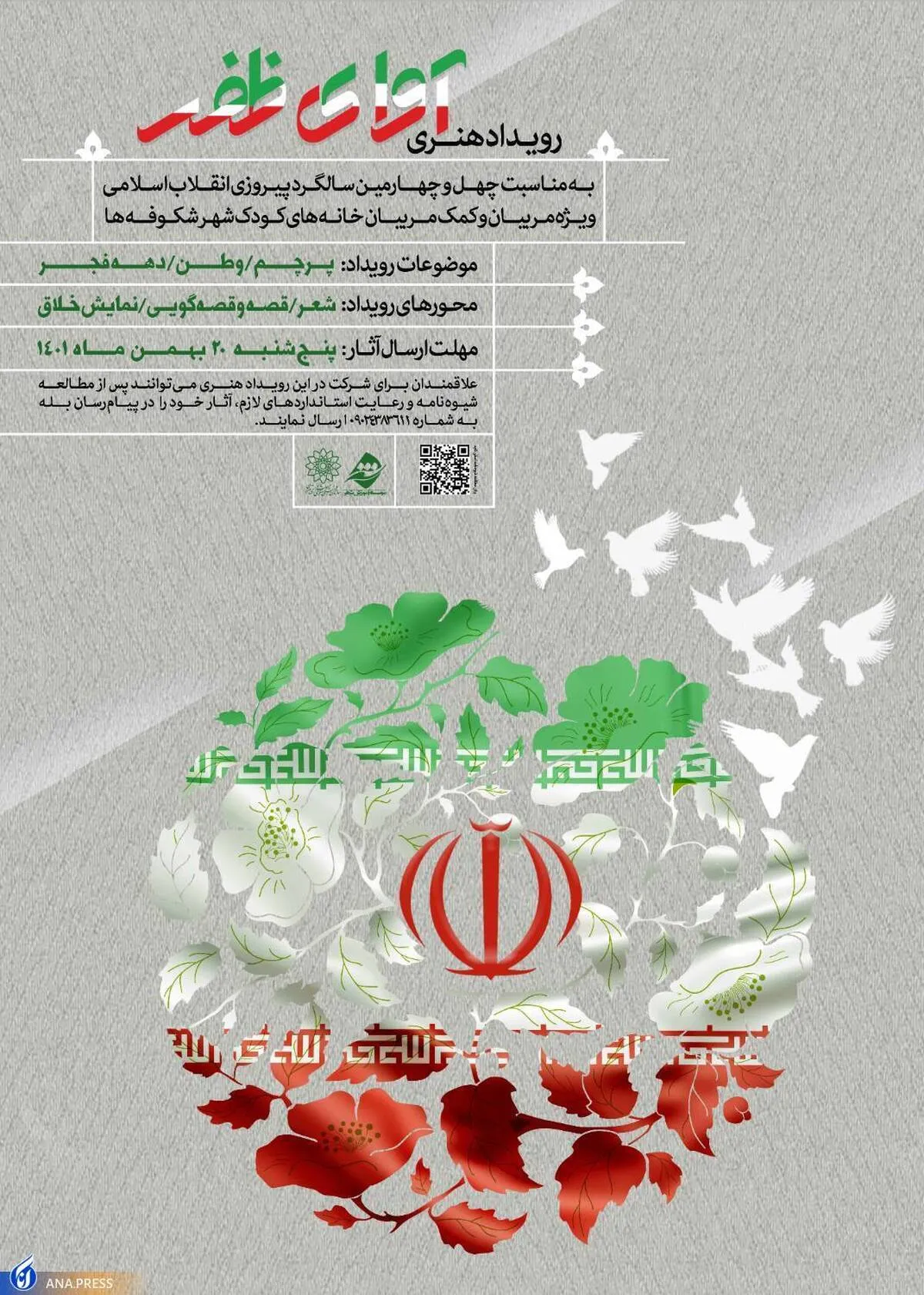رویداد هنری آوای ظفر با موضوعات پرچم، وطن و دهه فجر از ۱۲ تا ۲۰ بهمن‌ماه ۱۴۰۱ برگزار و نفرات برتر همزمان با مبعث حضرت رسول اکرم (ص) معرفی خواهند شد.