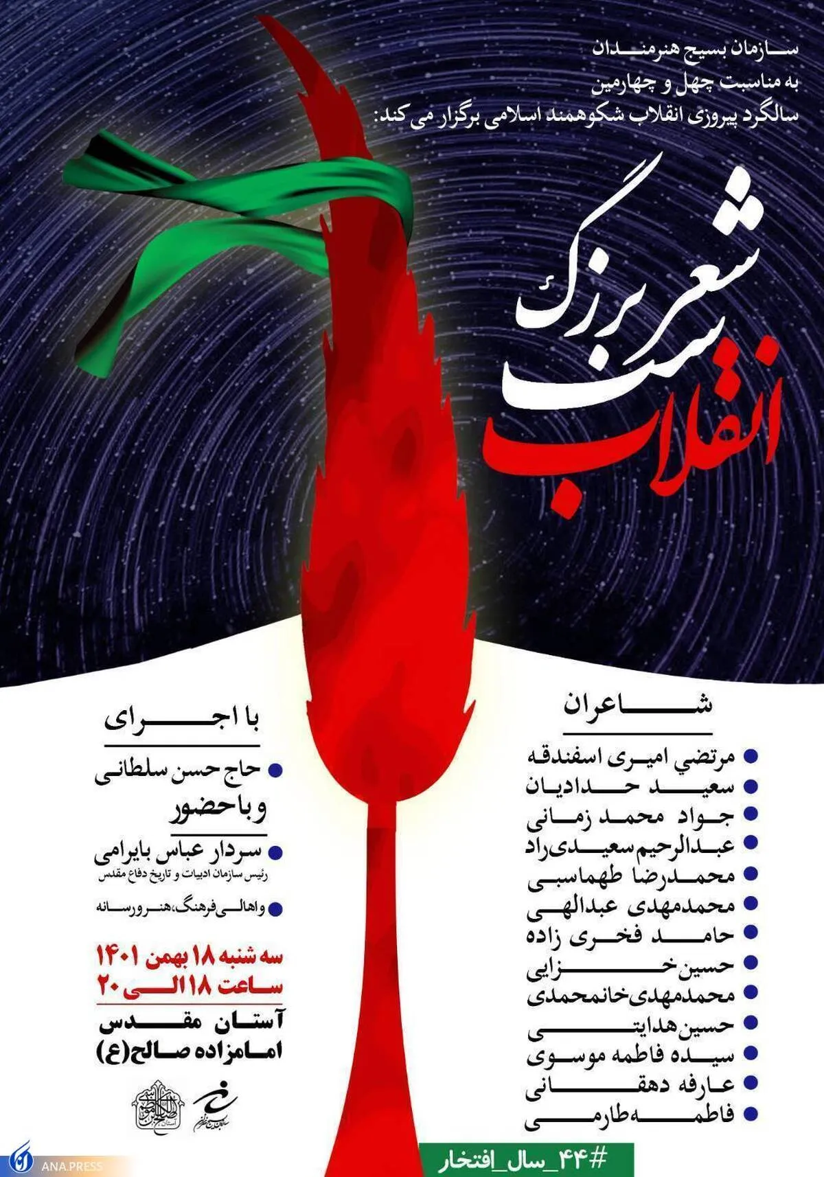 به گزارش خبرنگار کتاب و ادبیات خبرگزاری آنا، شب شعر بزرگ انقلاب به مناسبت چهل و چهارمین سالگرد پیروزی انقلاب شکوهمند اسلامی به همت سازمان بسیج هنرمندان کشور برگزار میشود.