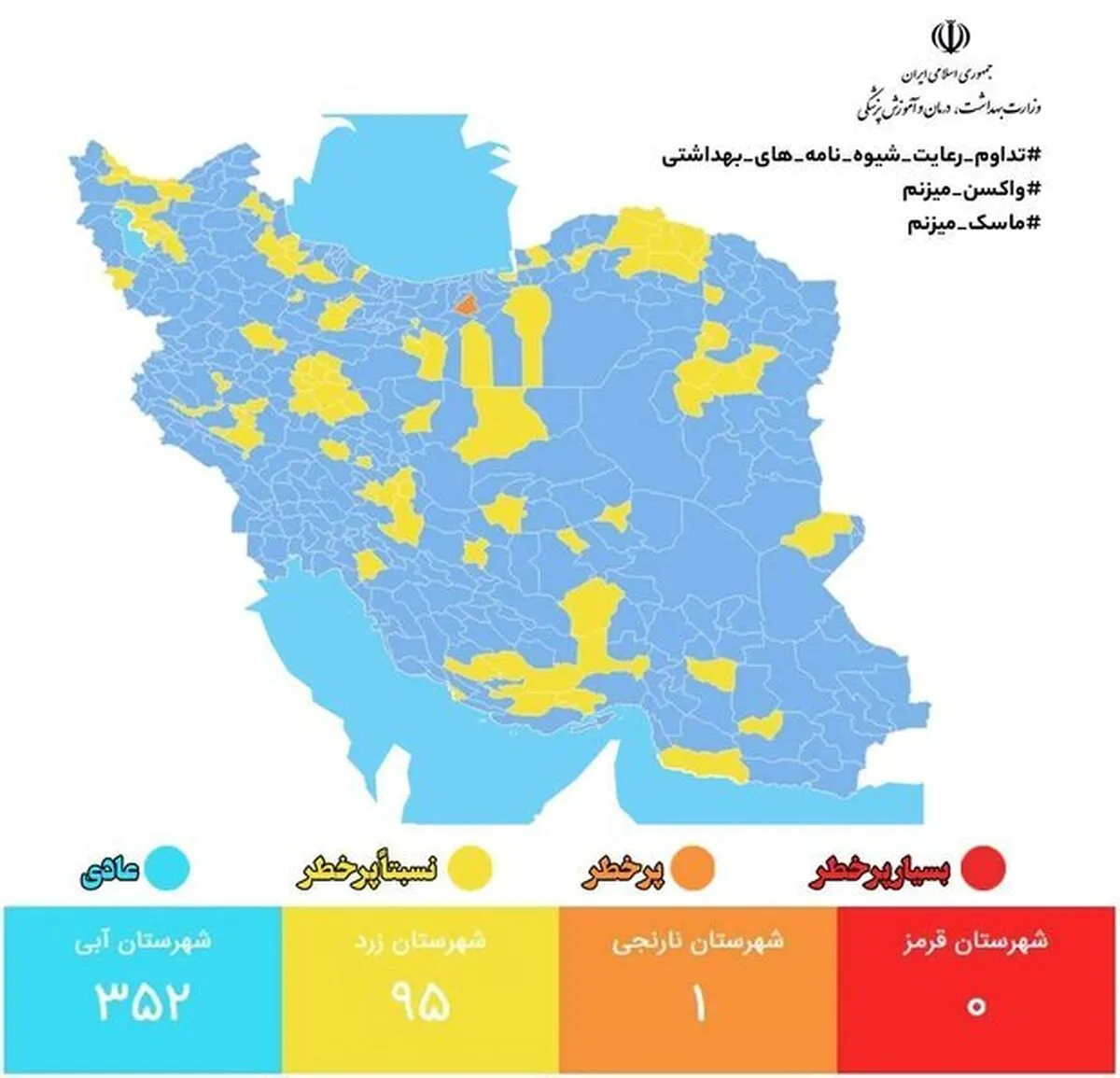 بر اساس آخرین به روز رسانیها، تعداد شهرهای با وضعیت قرمز همانند هفتههای گذشته صفر بوده و تعداد شهرهای با وضعیت نارنجی از ۲ به ۱ شهر کاهش یافت.
