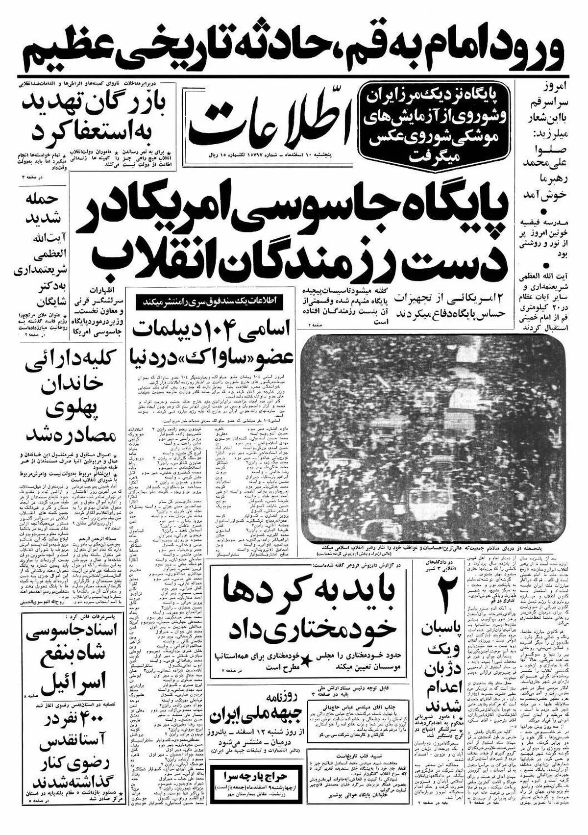 ظهر امروز رهبر انقلاب پس از 15سال تبعید و دوری از وطن با استقبال میلیونی مردم که شعار میدادند ، «صل علی محمد ، رهبر ما خوش آمد» وارد شهر مقدس قم شد، مراجع عظام تقلید و علمای اعلام نیز همدوش مردم برای استقبال از امام خمینی به 20کیلومتری شهر قم رفته و از رهبر انقلاب استقبال کردند .