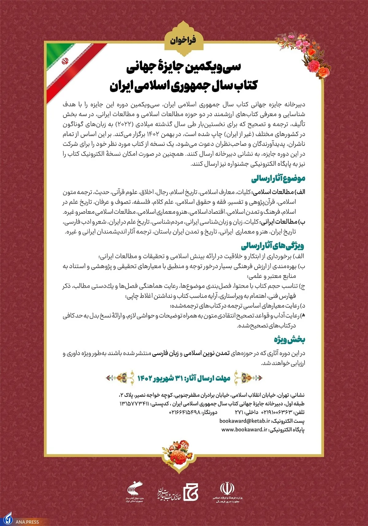 ناشران، پدیدآورندگان و صاحبنظران میتوانند آثار موردنظر خود را تا ۳۱ شهریورماه ۱۴۰۲ به نشانی تهران، خیابان انقلاب اسلامی، خیابان برادران مظفر جنوبی، کوچه خواجهنصیر، پلاک ۲، طبقه اول، دبیرخانه جایزه جهانی کتاب سال جمهوری اسلامی ایران، کدپستی ۱۳۱۵۷۷۳۴۱۱ ارسال کنند و برای کسب اطلاعات بیشتر با شماره تلفن ۰۲۱۹۱۰۰۶۳۶۳ داخلی ۲۷۱ تماس بگیرند.