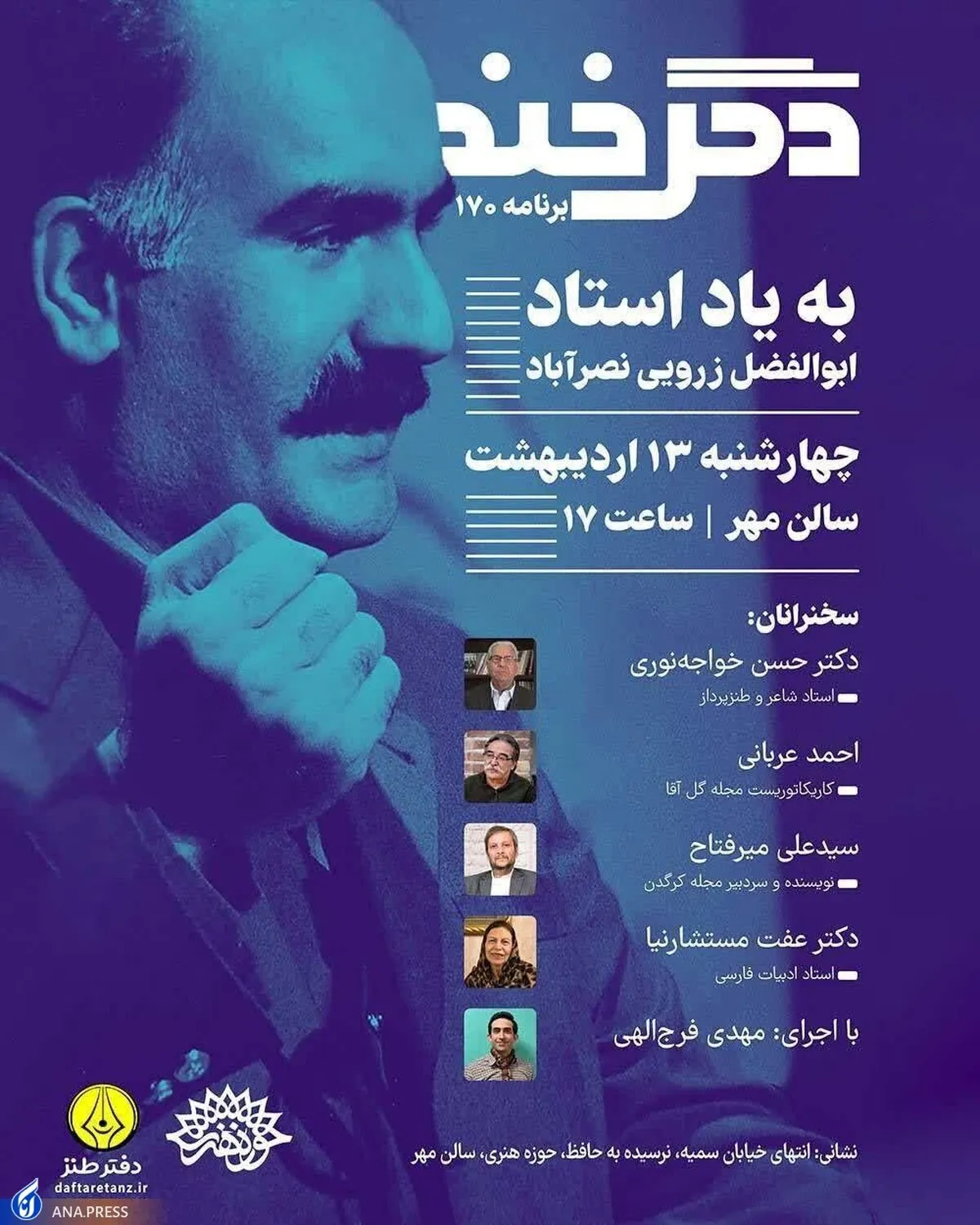 دراین نشست که اجرای آن را مهدی فرج اللهی برعهده دارد، پیشکسوتان طنزپرداز کشور همچون حسن خواجه نوری، احمد عربانی، سید علی میرفتاح و خانم دکتر عفت مستشارنیا حضور خواهند داشت. همچنین خاطراتی از استاد ابوالفضل زرویی نصرآباد توسط همکاران و دوستان وی بیان می شود.