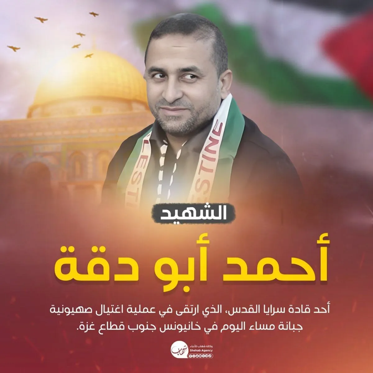 در همین حال خبرگزاری شهاب فلسطین از شهادت « احمد ابو دقه » جانشین «علی حسن غالی» (ابومحمد) عضو شورای نظامی و فرمانده یگان موشکی سرایا القدس (گردانهای قدس) در پی حمله امروز جنگنده های رژیم اسرائیل به منزل وی در شهرک بنی سهیلا در شهر خان یونس در جنوب نواز غزه خبر داد.