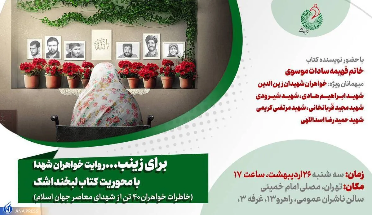 ساعت ۱۷ امروز سهشنبه ۲۶ اردیبهشت خواهر شهیدان زینالدین، شهید ابراهیم هادی، شهید شیرودی، شهید مجید قربانخانی، شهید مرتضی کریمی، شهید حمیدرضا اسداللهی به بهانه این کتاب، در غرفه انتشارات شهید کاظمی واقع در سالن ناشران عمومی، راهروی ۱۳، غرفه ۳ گرد هم میآیند.