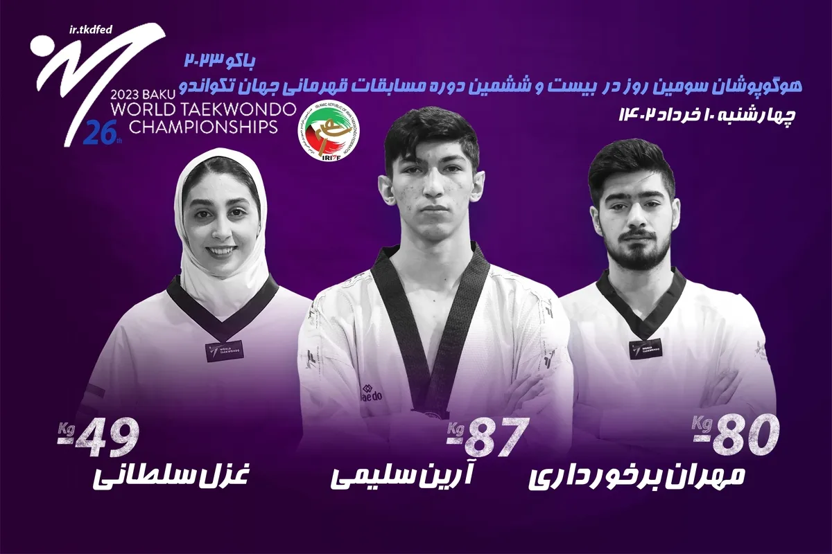 به گزارش خبرگزاری علم و فناوری آنا و به نقل از روابط عمومی فدراسیون تکواندو، بیست و ششمین دوره رقابتهای تکواندو قهرمانی جهان که از دوشنبه هشتم خرداد ماه در سالن ۲۵۰۰۰ نفری «کریستال» شهر باکو به میزبانی کشور جمهوری آذربایجان با حضور ۹۴۹ تکواندوکار آغاز شده، فردا (چهارشنبه) با برگزاری مبارزات اوزان ۴۹- کیلوگرم بانوان و ۸۰- و -۸۷ کیلوگرم آقایان پیگیری میشود که «غزل سلطانی»، «مهران برخورداری و آرین سلیمی» نمایندگان تیم ملی تکواندو ایران در روز سوم این رویداد خواهند بود.