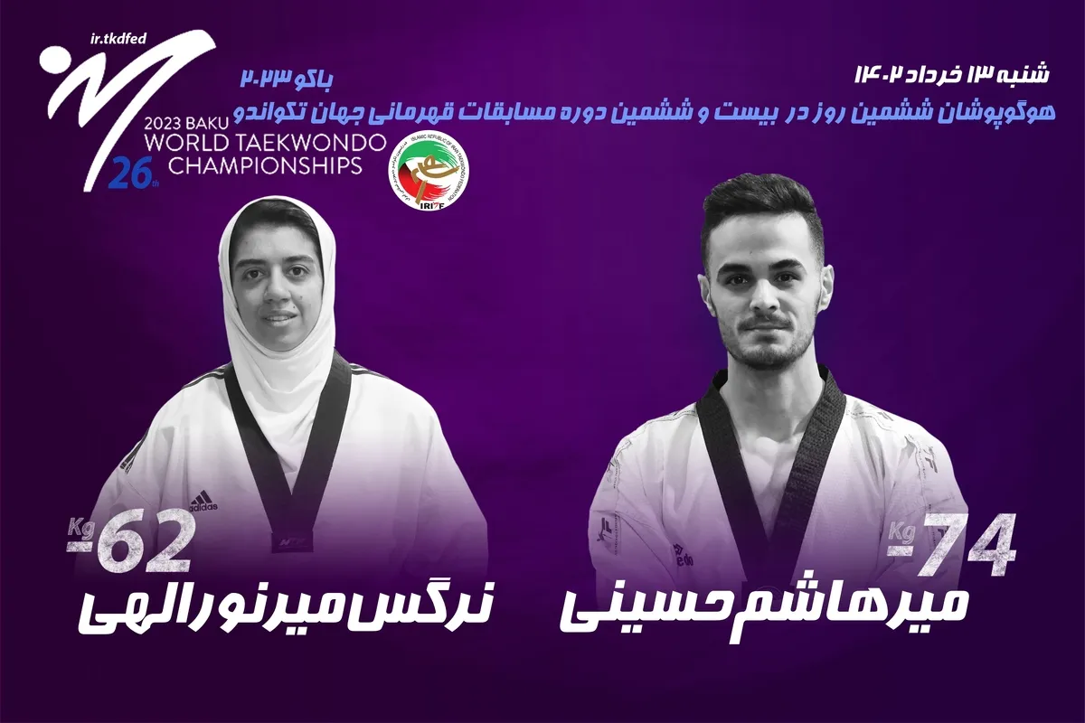 به گزارش خبرگزاری علم و فناوری آنا و به نقل از روابط عمومی فدراسیون تکواندو، در ادامه بیست و ششمین دوره رقابت‌های تکواندو قهرمانی جهان که در سالن ۲۵۰۰۰ نفری «کریستال» شهر باکو به میزبانی کشور جمهوری آذربایجان جریان دارد فردا شنبه ۱۳ خردادماه و در روزششم، مبارزات اوزان ۶۲- کیلوگرم بانوان و ۷۴- کیلوگرم آقایان برگزار خواهد شد و «سیده نرگس میرنوراللهی» و «میرهاشم حسینی» نمایندگان تیم ملی تکواندو ایران خواهند بود.