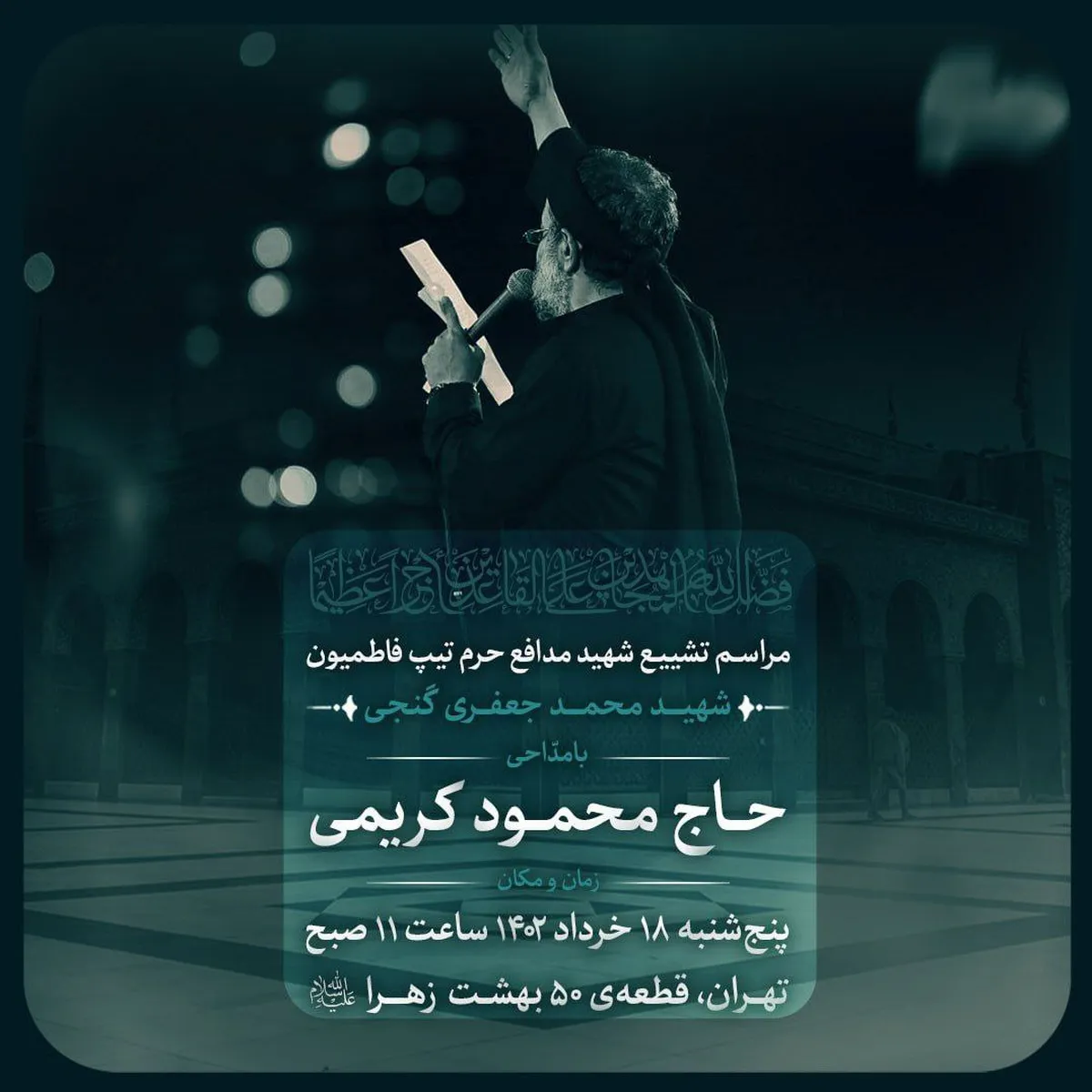 این مراسم ساعت ۱۱ پنجشنبه ۱۸ خرداد در قطعه ۵۰ بهشت حضرت زهرا(س) برگزار میشود و حاج محمود کریمی به عنوان مداح، در این مراسم مدیحهسرایی میکند.
