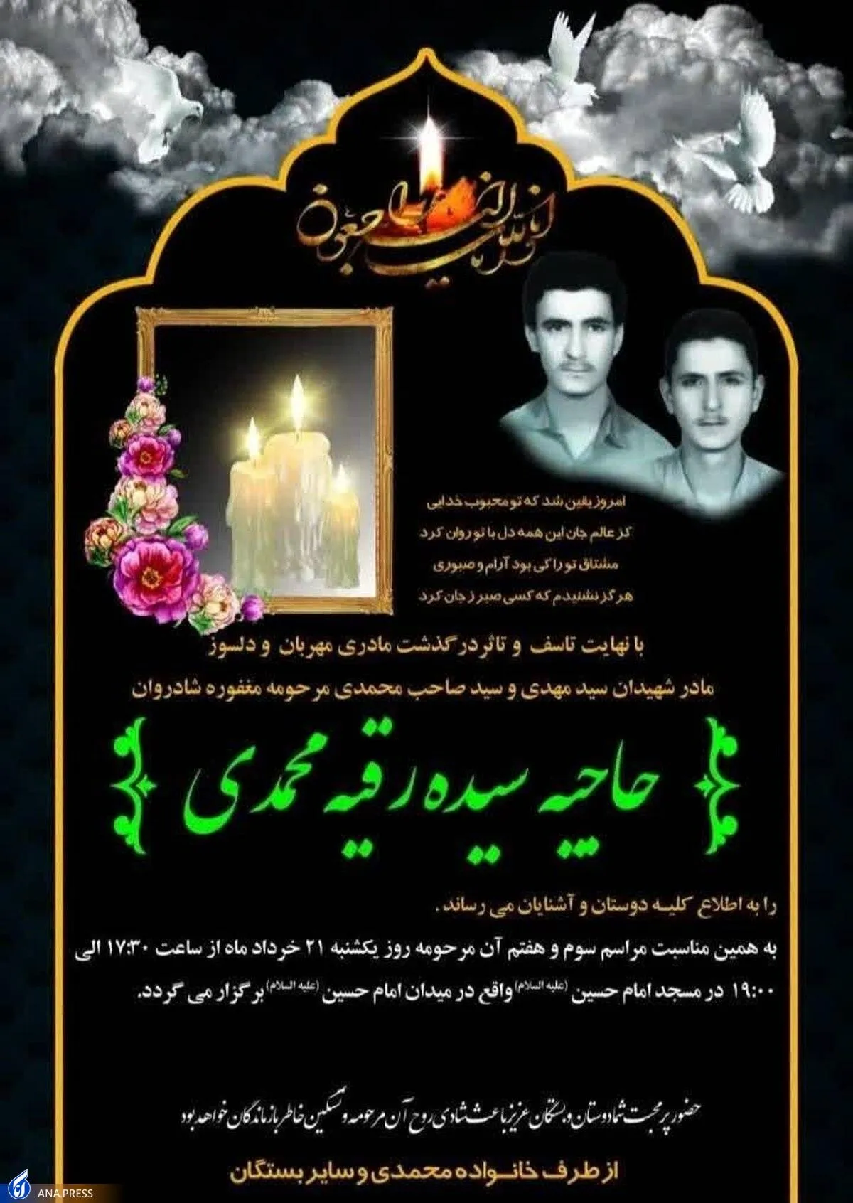 مراسم سوم و هفتم حاجیه خانم محمدی عصر امروز ساعت ۱۷/۳۰ در مسجد امام حسین (ع) واقع در میدان امام حسین (ع) برگزار میشود.
