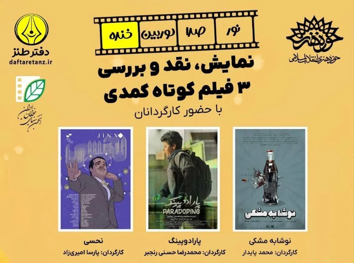 نشست جدید جدید نور، صدا، دوربین، خنده به نمایش سه فیلم «نوشابه مشکی» به کارگردانی محمد پایدار، «پارادوپینگ» به کارگردانی محمدرضا حسنیرنجبر و فیلم «نحسی» به کارگردانی پارسا امیریزاد اختصاص دارد که توسط دفتر طنز برگزار میشود، میزبان علاقهمندان به فیلم و کمدی خواهد بود.