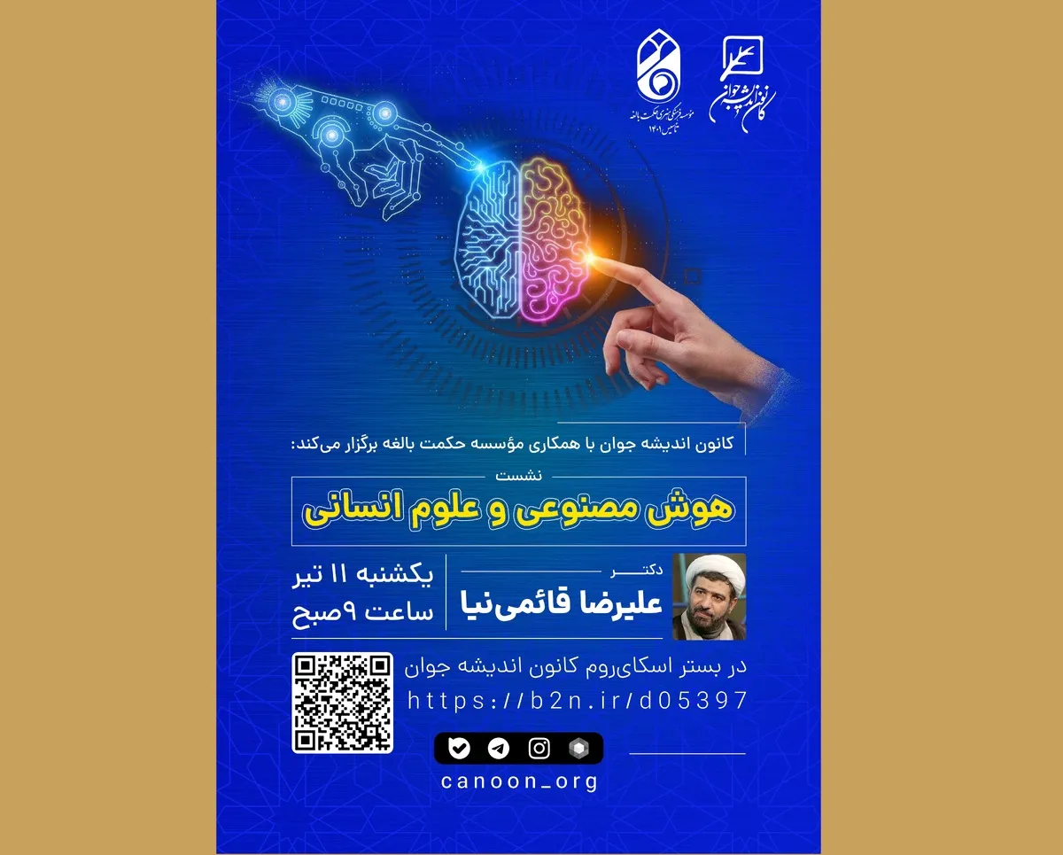در همین راستا کانون اندیشه جوان قصد دارد تا در روز یکشنبه ۱۱ تیر ساعت ۹ صبح با حضور علیرضا قائمی نیا نشستی مجازی تحت عنوان «هوش مصنوعی و علوم انسانی» را برگزار کند، این نشست به صورت برخط در اسکای روم کانون اندیشه جوان به نشانی b2n.ir/d05397 در دسترس است.