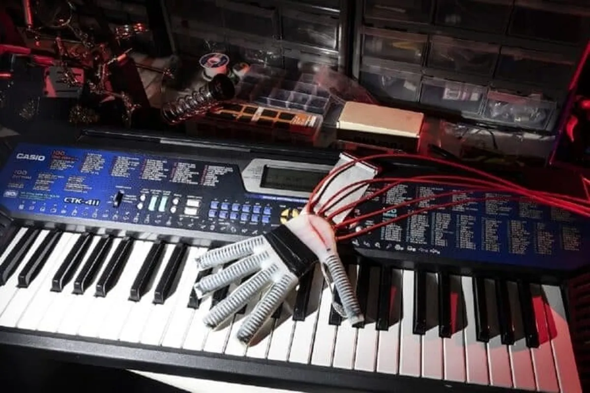 در این پیشرفت جدید، یک گروه از دانشگاه آتلانتیک فلوریدا (Florida Atlantic University)، یک دستکش رباتیک خاص ابداع کردند که در آن از هوش مصنوعی برای بالا بردن چالاکی حرکت دست استفاده شده است. این استخوانبندی بیرونی دست رباتیک نرم (soft robotic hand exoskeleton)، دارای حسگرهای لمسی انعطافپذیر، عملگر مکانیکی نرم و قابلیتهای هوش مصنوعی است؛ و باعث میشود که اولین دستکشی باشد که بین اجرای درست و نادرست هر قطعۀ موسیقی تمایز قائل شود. ترکیب این ویژگیها در یک استخوانبندی بیرونی تکدست، فرصتهای جدیدی را برای توانبخشی افراد دچار سکتۀ مغزی و یادگیری مجدد مهارتهای پیانو ایجاد میکند.