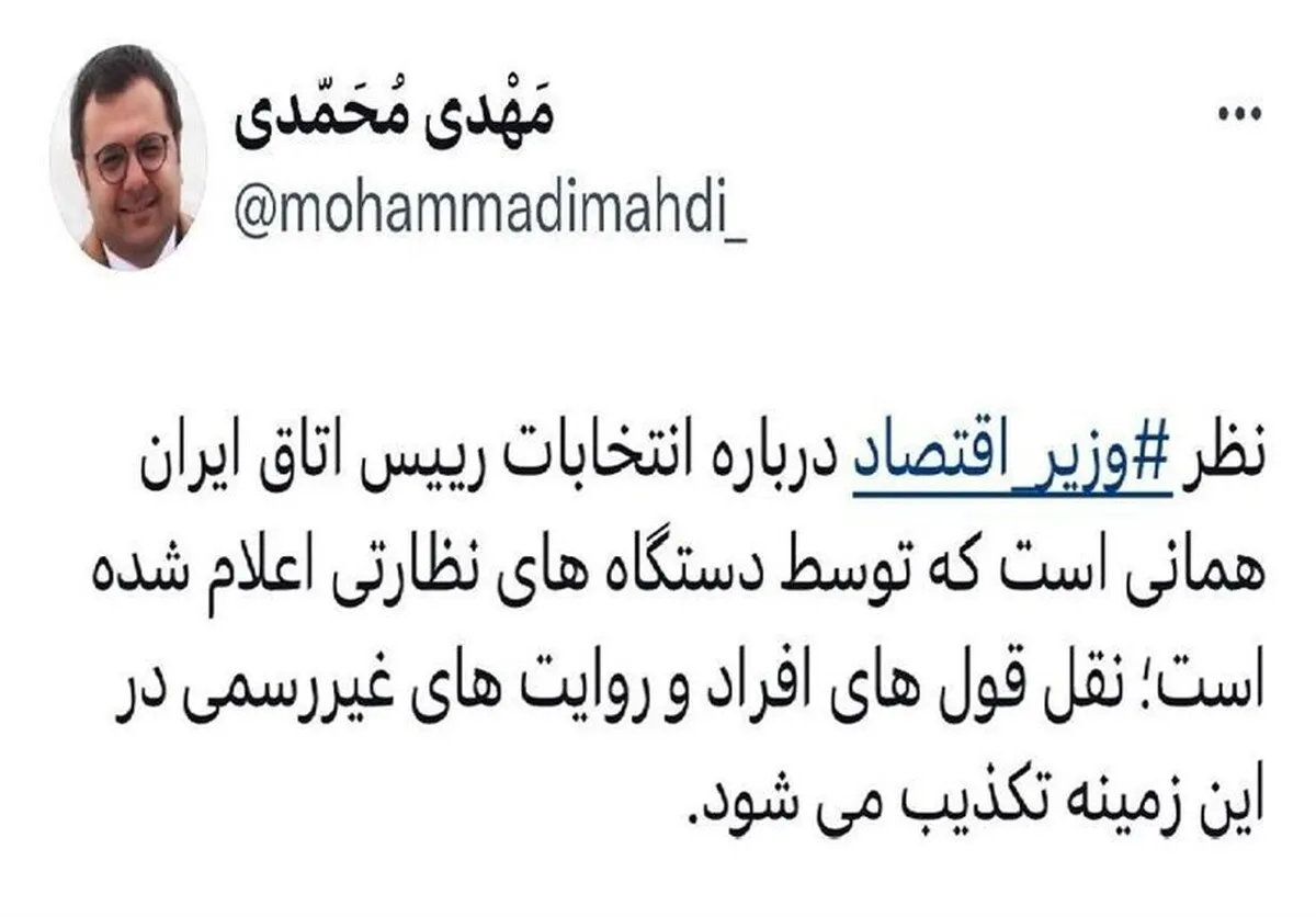 مهدی محمدی با انتشار توییتی در حساب شخصی اش نوشت: «نظر وزیر اقتصاد درباره انتخابات رییس اتاق ایران همانی است که توسط دستگاههای نظارتی اعلام شده است؛ نقل قولهای افراد و روایتهای غیررسمی در این زمینه تکذیب میشود.»