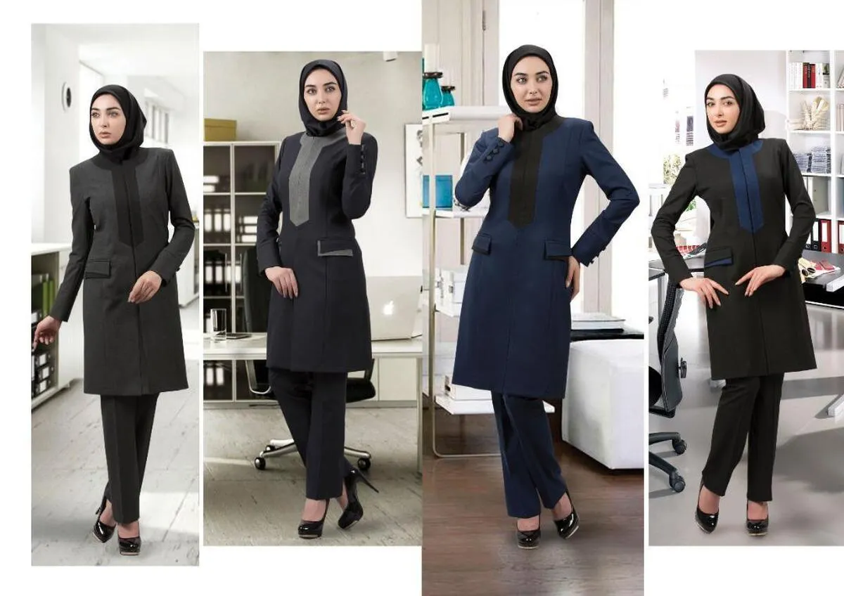 مانتو شلوارهای فرم آماده که در شرکت‌ها معمولا مورد استفاده قرار می‌گیرند اغلب سورمه‌ای یا طوسی هستند. بعضی از آنها که «طرح‌دار» هستند با یک یا دو نوار روبان طلایی یا نقره‌ای روی مقنعه که با آستین و گاهی هم یقه ست شده‌اند از بقیه متمایز می‌شوند.