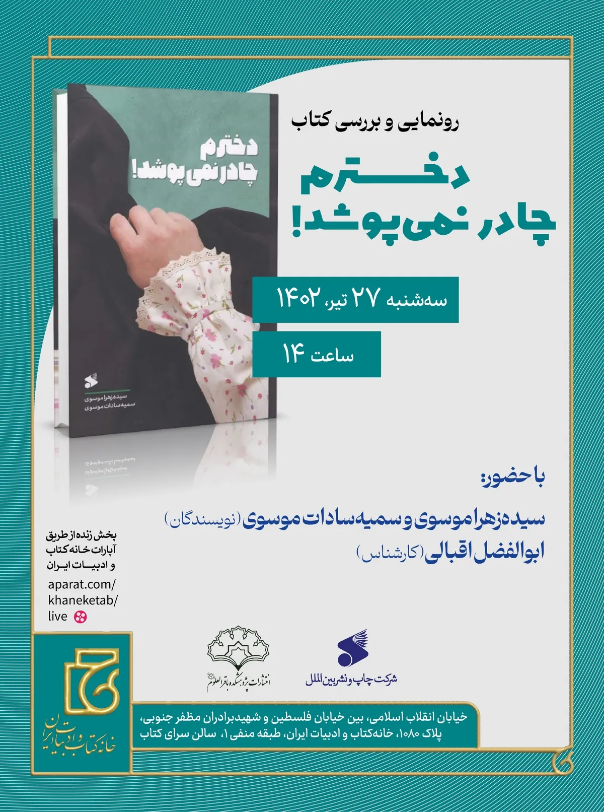 علاقهمندان به حضور در آیین رونمایی از کتاب «دخترم چادر نمیپوشد!» میتوانند در ساعت و روز تعیین شده به سرای کتاب خانه کتاب و ادبیات ایران به نشانی خیابان انقلاب اسلامی، بین فلسطین و شهید برادران مظفر جنوبی، پلاک ۱۰۸۰، طبقه منهای یک مراجعه کنند.