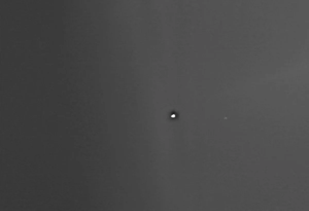 نقطه سفید زمین و حباب کم نورتر، ماه است. این صحنه توسط مدارگرد مریخ آژانس فضایی اروپا شکار شده که ۲۰ سال بوده دور سیاره سرخ میچرخد. این کاوشگر نمایی نادر از ماه را که در فاصله ۱۸۶.۴ میلیون مایلی دور سیاره ما در حال چرخش است، ثبت کرد.