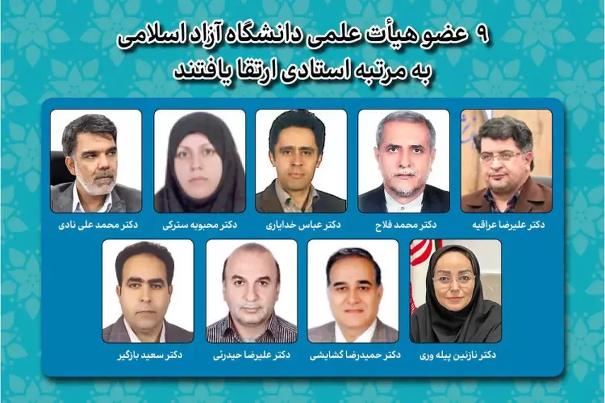 در این جلسات پس از بحث و بررسی پرونده ها، ۹ عضو هیئت علمی دانشگاه آزاد اسلامی به مرتبه استادی ارتقا یافتند.