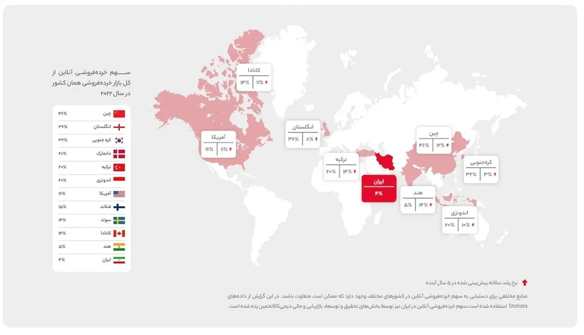 به گزارش گروه بازار خبرگزاری علم و فناوری آنا، بررسی کارنامهی اقتصادهای بزرگ سراسر جهان یادآور یک حقیقت غیر قابل انکار است: «نوبت توسعه تجارت الکترونیک رسیده» گزارشهای منتشر شده از وضعیت اقتصاد جهان در سال ۲۰۲۲ نشان میدهد که سهم خردهفروشیهای آنلاین در چین (نسبت به خرده فروشی آفلاین) به ۴۶ درصد رسیده است. برای انگلستان این رقم ۳۶ درصد و برای کره جنوبی ۲۳ درصد برآورد میشود. در همسایگی ایران، ترکیه با سهم ۲۰ درصدی خودنمایی میکند و این در حالی است که سهم خردهفروشی آنلاین در ایران تنها ۴ درصد است.