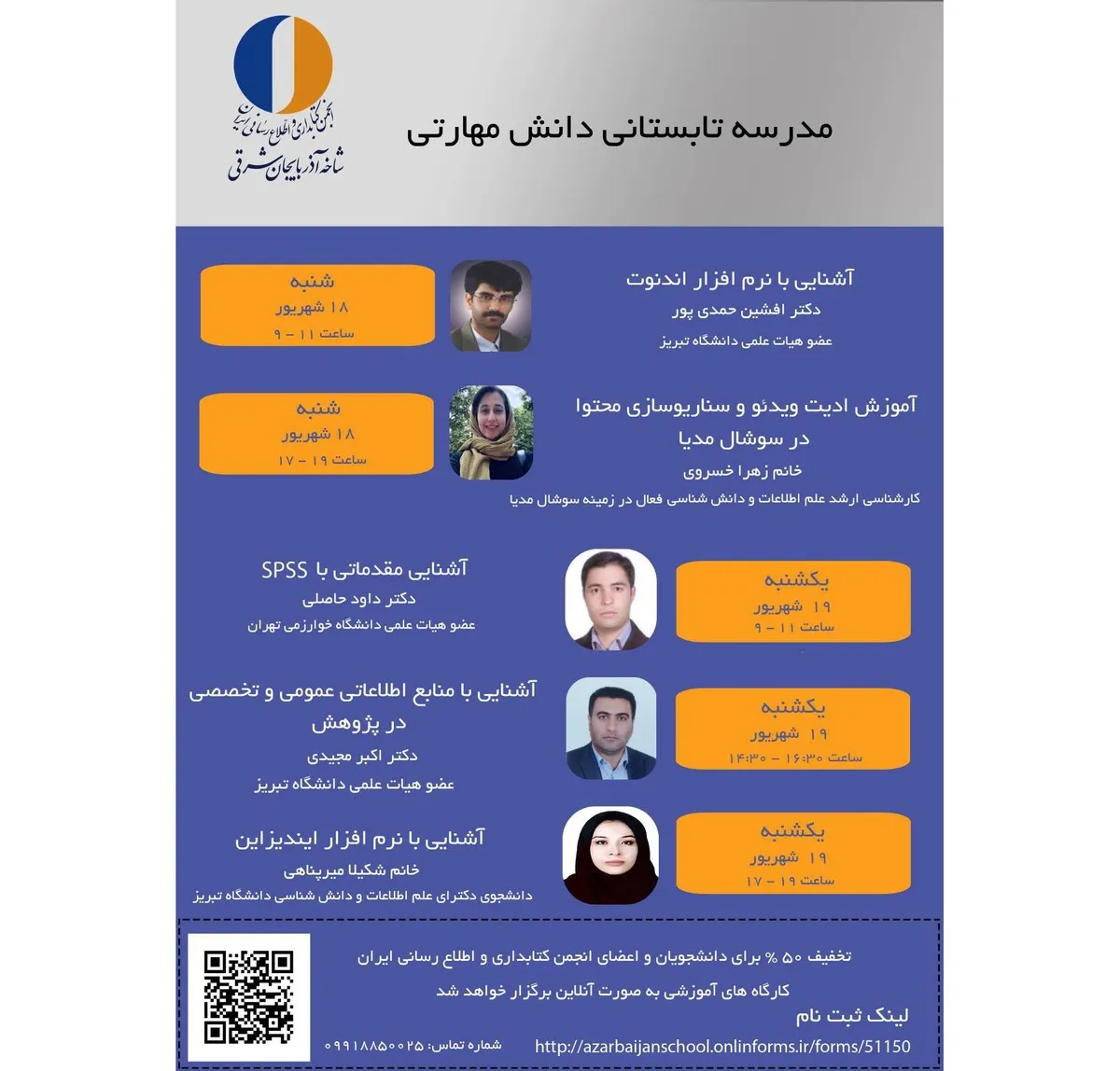 به گزارش گروه فرهنگ و جامعه خبرگزاری علم و فناوری آنا، دکتر رحمان ابراهیمی رییس هیئت مدیره شاخه آذربایجان شرقی بیان کرد که مدرسه تابستانی دانش مهارتی در راستای افزایش دانش و مهارتهای کاری دانشجویان، فارغالتحصیلان، و علاقمندان به پژوهش و تولید محتوا، با هدف فراهمآوردن فرصت آموزشی، یاددهی مهارتهای جدید، استفاده از دانش به روز و آموزش برنامههای کاربردی مفید در جهت کارآفرینی و کسب و کار به دانشجویان و دانشآموختگان، در روزهای شنبه و یکشنبه (۱۸ -۱۹ شهریور ماه ۱۴۰۲) به صورت مجازی در فضای ادوبی کانکت انجمن کتابداری و اطلاع رسانی ایران برگزار میشود.