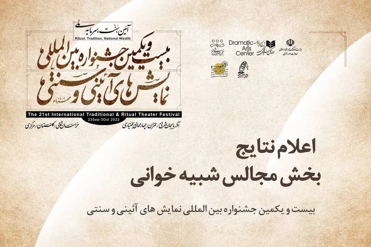 هیئت ارزیابی و انتخاب «بخش مجالس شبیه خوانی» بیست و یکمین جشنواره بین المللی نمایش‌های آیینی و سنتی نتایج پذیرفته شدگان نهایی دو حوزه «مجالس غریب» و «مجالس نو» این بخش را معرفی کردند.