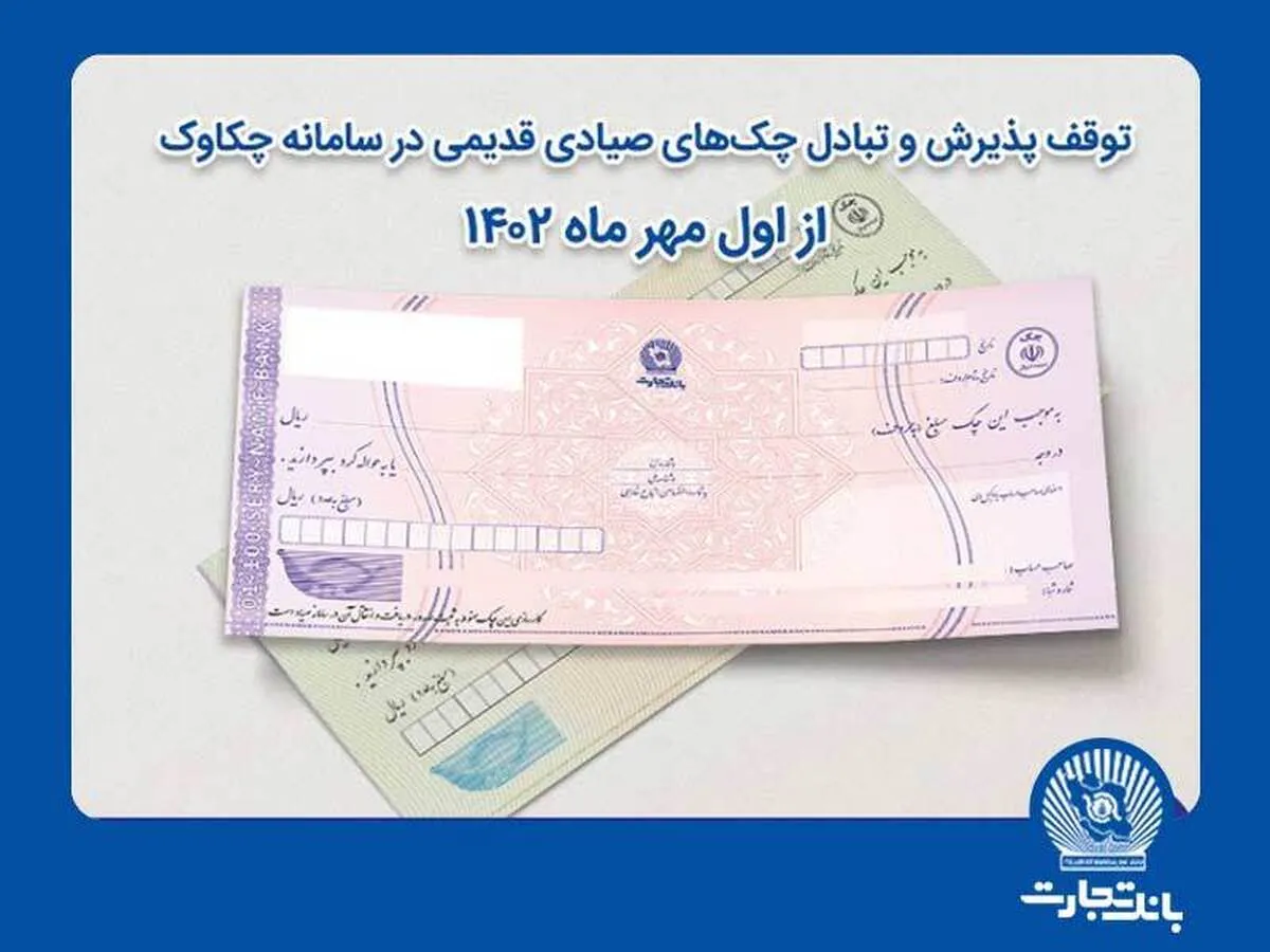 به گزارش گروه بازار خبرگزاری علم و فناوری آنا به نقل از مدیریت روابط‌عمومی و ارتقاء سرمایه اجتماعی بانک تجارت، بر اساس این ابلاغ و با توجه به اثرات مثبت قانون اصلاح قانون چک و توزیع دسته‌چک‌های صیادی جدید (به رنگ بنفش) و نیز تعمیق نفوذ چک‌های موصوف در جامعه، پذیرش و تبادل چک‌های صیادی قدیمی (دسته‌چک‌های صادر شده پیش از سال ۱۴۰۰) از طریق "سامانه چکاوک" از ابتدای مهرماه سال جاری متوقف شده و وصول وجه این چک‌ها، صرفا از طریق شعب بانک صادرکننده چک، امکان‌پذیر خواهد بود.