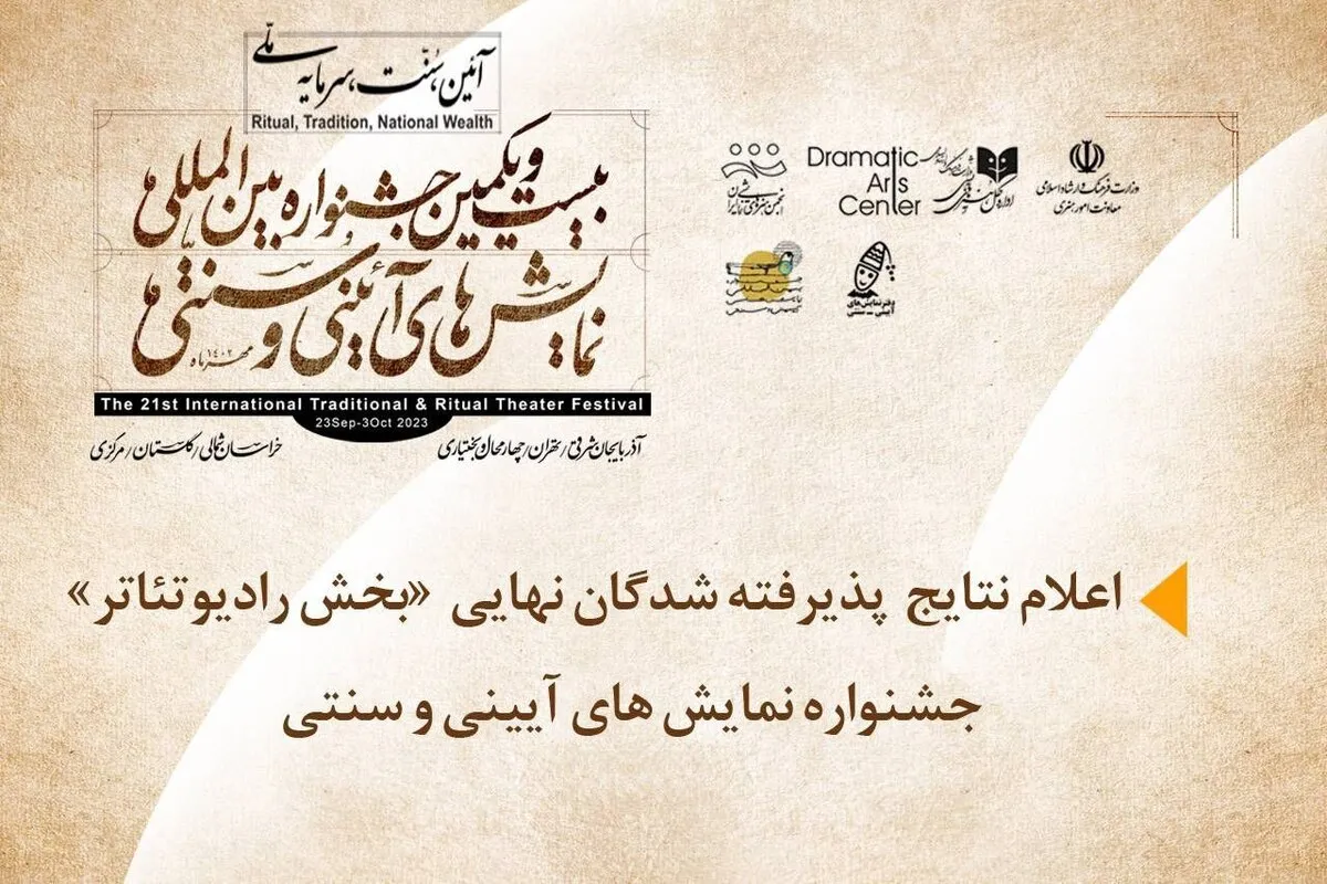به گزارش گروه فرهنگ و جامعه خبرگزاری علم و فناوری آنا، هیئت ارزیابی و انتخاب «بخش رادیو تئاتر» بیست و یکمین جشنواره بین المللی نمایشهای آیینی و سنتی متشکل از بهرام سروری نژاد، امین راهبر و علی بهرامی نتایج آثار پذیرفته شده این بخش را معرفی کردند.
