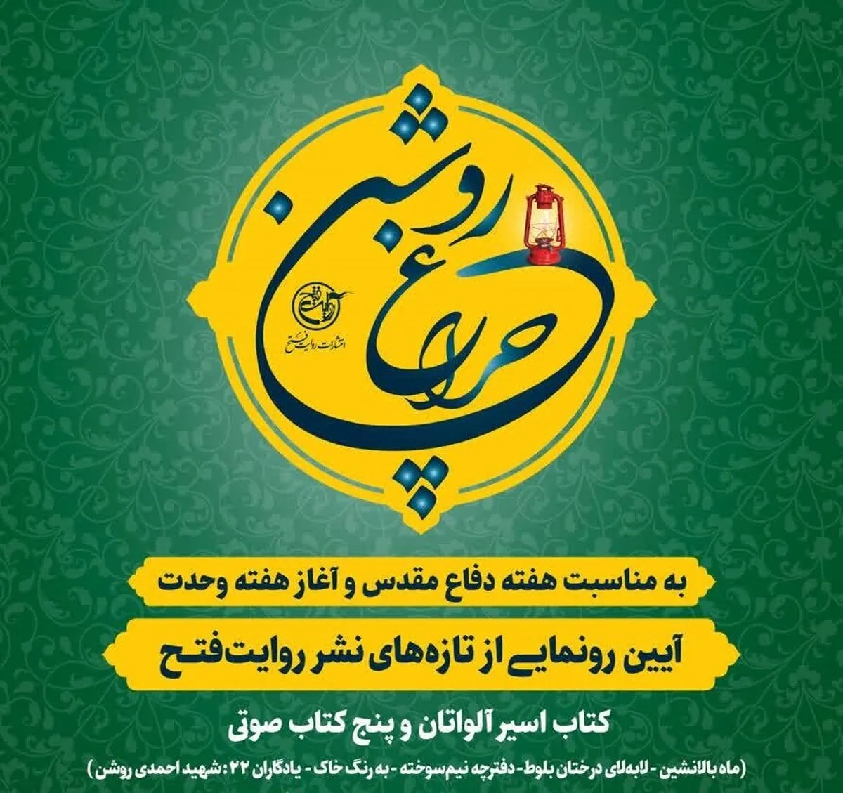 به اطلاع میرساند مراسم چراغ روشن با آیین رونمایی از تازههای نشر روایت فتح به مناسبت هفته دفاع مقدس و آغاز هفته وحدت روز سه شنبه ۴ مهر ۱۴۰۲ از ساعت ۱۵ الی ۱۷ در بنیاد فرهنگی روایت فتح برگزار خواهد شد.