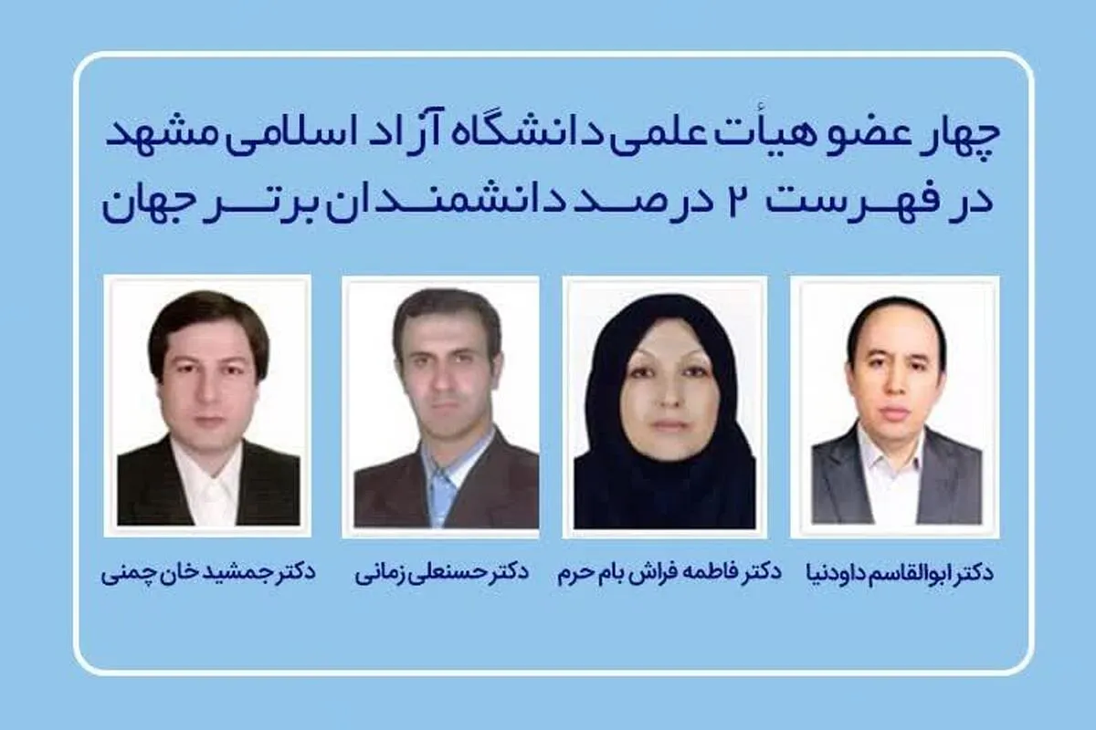 به گزارش خبرنگار گروه استانهای خبرگزاری علم و فناوری آنا، سرپرست اداره نظارت و تولید علم دانشگاه آزاد اسلامی مشهد با اعلام این خبر که چهار عضو هیئت علمی دانشگاه آزاد اسلامی مشهد در فهرست ۲ درصد دانشمندان برتر جهان قرار گرفتند، گفت: بر اساس آخرین ارزیابی انجام گرفته توسط پایگاه اسکوپوس در ۱ اکتبر ۲۰۲۳، جمشید خان چمنی، فاطمه فراش بام حرم، حسن علی زمانی و ابوالقاسم داوودنیا اعضای هیئت علمی این دانشگاه بهعنوان دانشمندان دودرصد پراستناد برتر دنیا معرفی شدند.