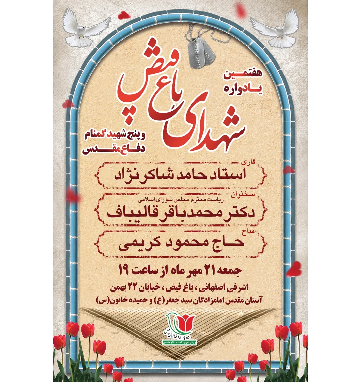 هفتمین یادواره شهدای باغ فیض و پنج شهید گمنام دفاع مقدس، بیست و یکم مهر ماه برگزار می‌شود.