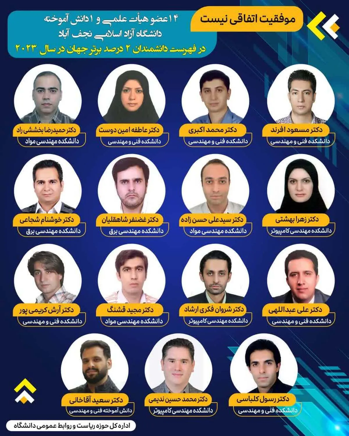 فرید نعیمی عنوان کرد: بر اساس بررسیها و اعلام پایگاه اسکوپوس آرش کریمیپور، مسعود افرند، محمد اکبری، خوشنام شجاعی، حمیدرضا بخششیراد، سیدعلی حسنزاده، رسول کلباسی، زهرا بهشتی، غضنفر شاهقلیان، شروان فکری ارشاد، عاطفه امیندوست، محمدحسین ندیمی، مجید قشنگ، علی عبداللهی و سعید آقاخانی دانشآموخته رشته مهندسی مکانیک دانشگاه آزاد اسلامی نجفآباد در لیست دانشمندان ۲ درصد برتر دنیا در سال ۲۰۲۳ قرار گرفتند.