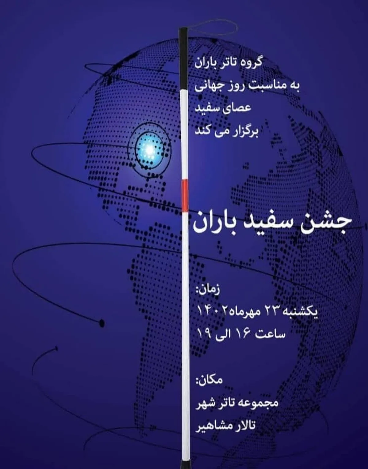 به گزارش گروه فرهنگ وجامعه خبرگزاری علم و فناوری آنا، جشن روز جهانی عصای سفید روز ۲۳ مهرماه ساعت ۱۶ در سالن مشاهیر مجموعه تئاترشهر و با حضور هنرمندان و مدیرانی از سازمان بهزیستی کشور، خانه تئاتر و وزارت فرهنگ و ارشاد اسلامی برگزار میشود.