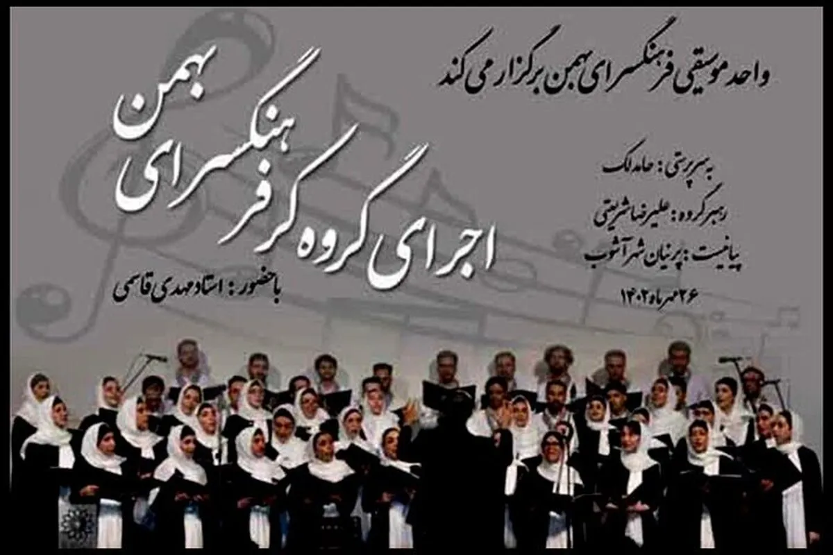 نخستین اجرای موسیقی «گروه کُر» فرهنگسرای بهمن روز چهارشنبه بیست و ششم مهر در سالن مبارک این مجموعه برگزار می‌شود.