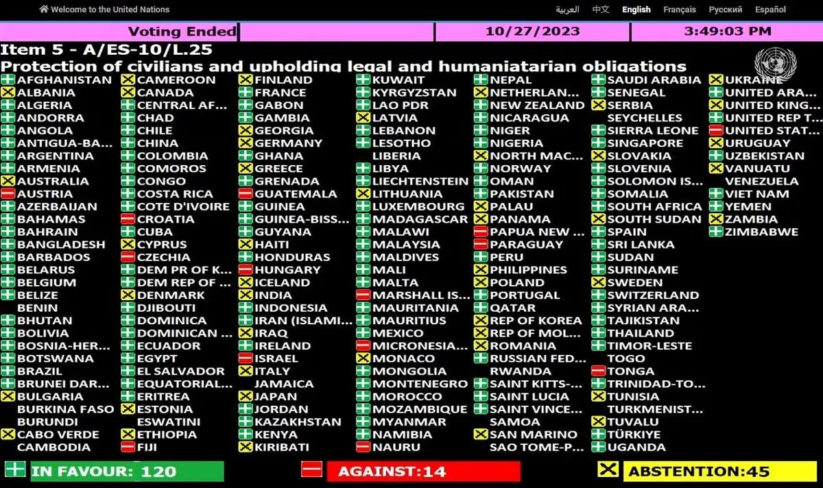 موضوع از این قرار بود که قطعنامه پیشنهادی که با عنوان «حفاظت از غیرنظامیان و پایبندی به تعهدات حقوقی و بشردوستانه» توسط اردن به نمایندگی از کشور‌های عربی ارائه شده و مورد حمایت ده‌ها کشور دیگر عضو سازمان ملل قرار گرفت، در مجمع عمومی با اکثریت ۱۲۰ رأی موافق در مقابل ۱۴ رأی مخالف به تصویب رسید در حالی که ۴۵ کشور نیز به آن رأی ممتنع دادند.