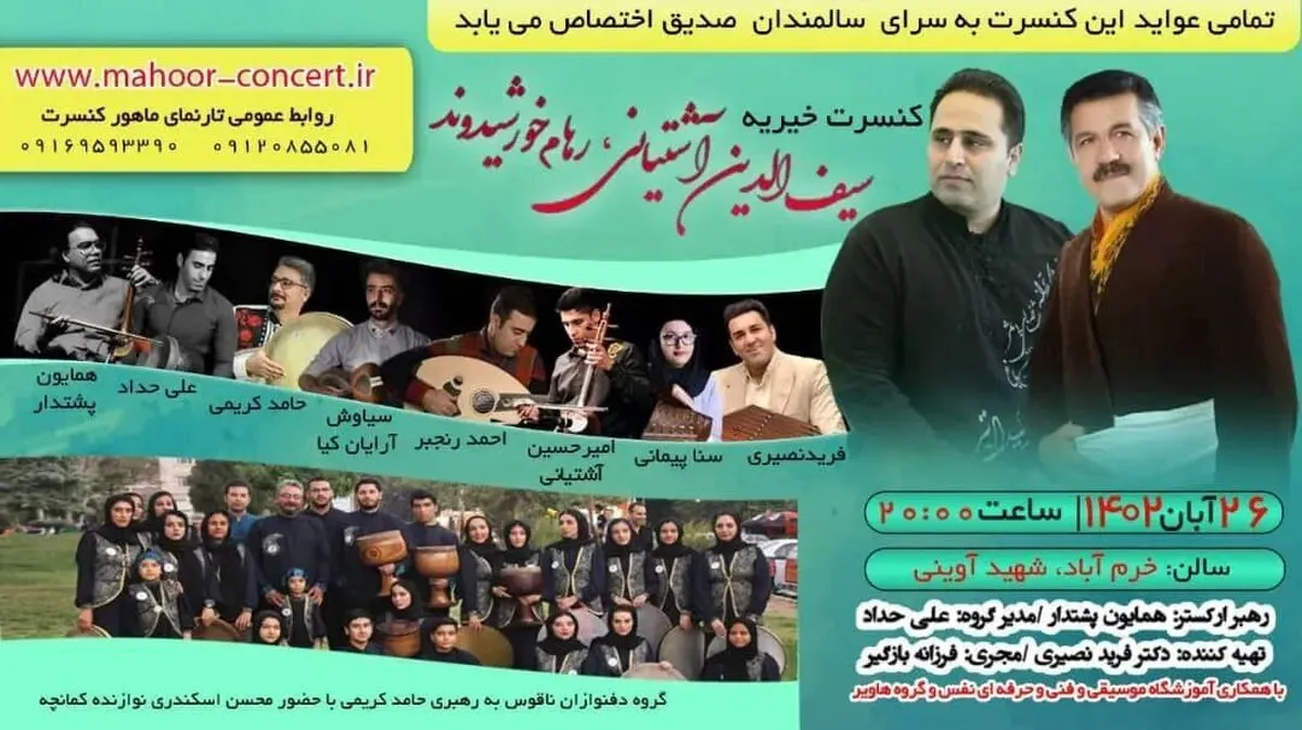 این کنسرت بیست و ششم آبان ماه ساعت بیست در سالن شهید آوینی خرم آباد برپا میشود.