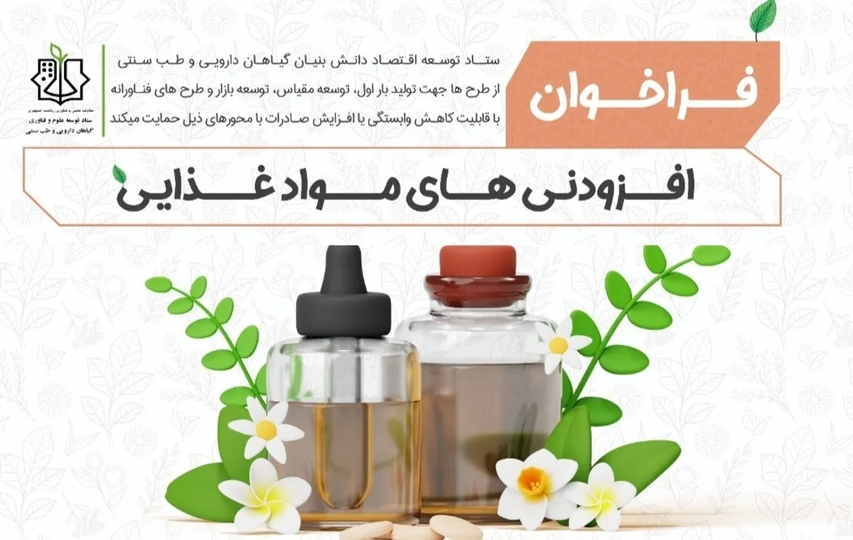 ستاد توسعه اقتصاد دانشبنیان گیاهان دارویی و طب سنتی معاونت علمی، فناوری و اقتصاد دانش بنیان ریاست جمهوری طی فراخوانی از تولید بار اول، توسعه مقیاس، توسعه بازار و طرحهای فناورانه در حوزه افزودنیهای مواد غذایی حمایت میکند.