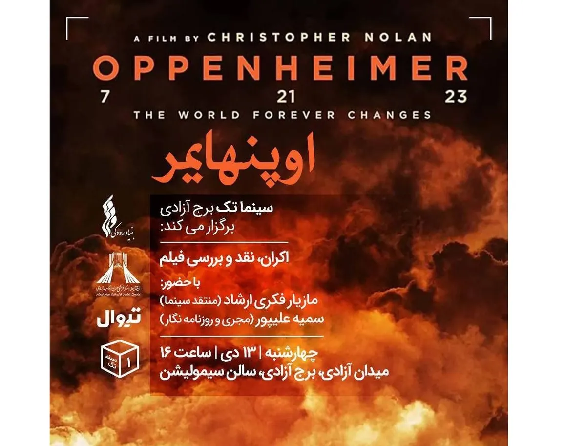 اولین برنامه سینماتک برج آزادی چهارشنبه، ۱۳ دی به نمایش فیلم «اوپنهایمر» به کارگردانی کریستوفر نولان محصول ۲۰۲۳ اختصاص دارد.
