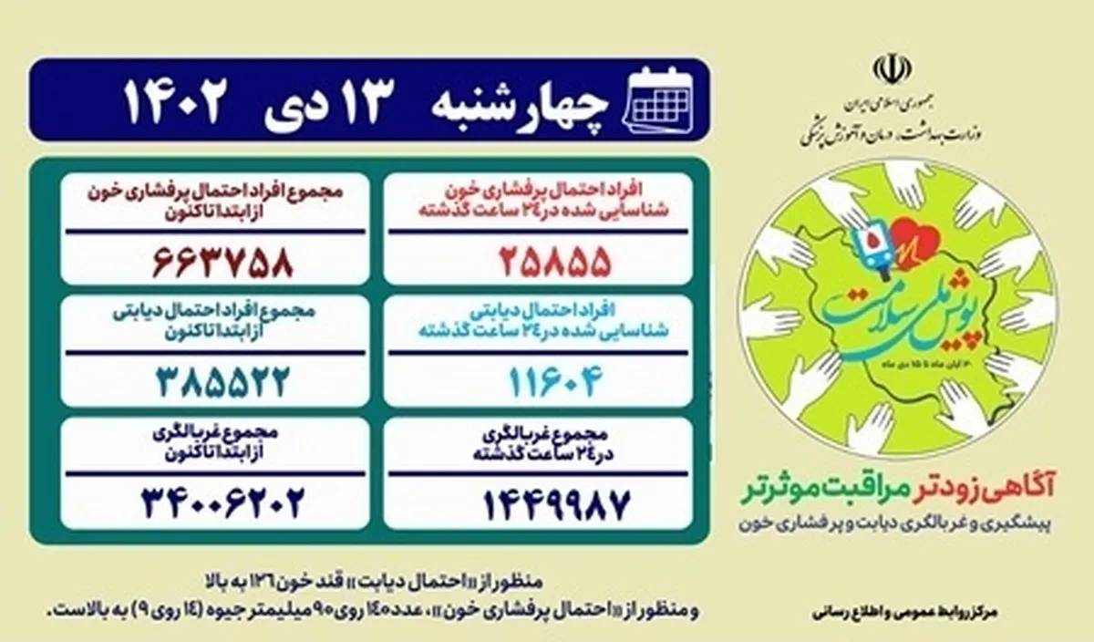 همچنین در ۲۴ ساعت گذشته یک میلیون و ۴۴۹ هزار و ۹۸۷ نفر در این پویش غربالگری شدند که از این تعداد ۲۵ هزار و ۸۵۵ نفر با احتمال پرفشاری خون و ۱۱ هزار و ۶۰۴ نفر با احتمال دیابت شناسایی شدند.