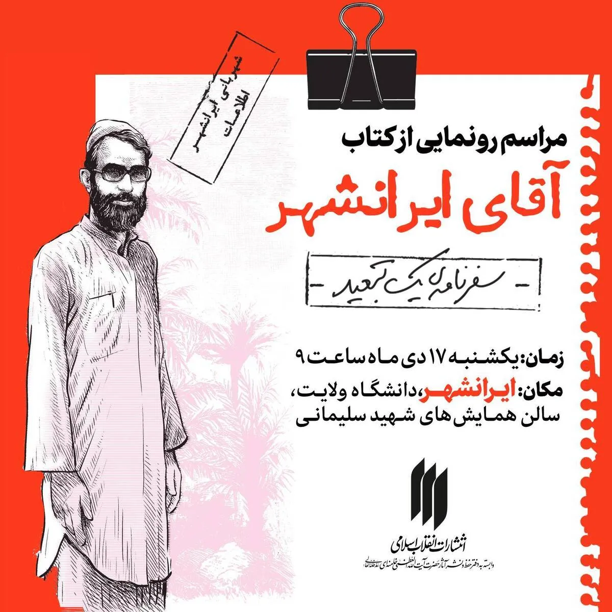 مراسم رونمایی از تازهترین اثر انتشارات انقلاب اسلامی وابسته به دفتر حفظ و نشر آثار حضرت آیتاللهالعظمی خامنهای(مدّظلّهالعالی) با عنوان «آقای ایرانشهر» روز یکشنبه ۱۷ دی ماه در شهرستان ایرانشهر برگزار میشود.