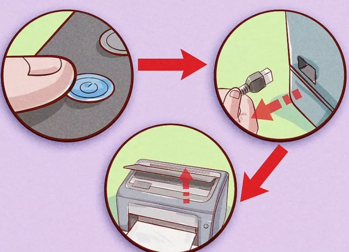 - مرحله اول: خاموش کردن و باز کردن درهای پرینتر.