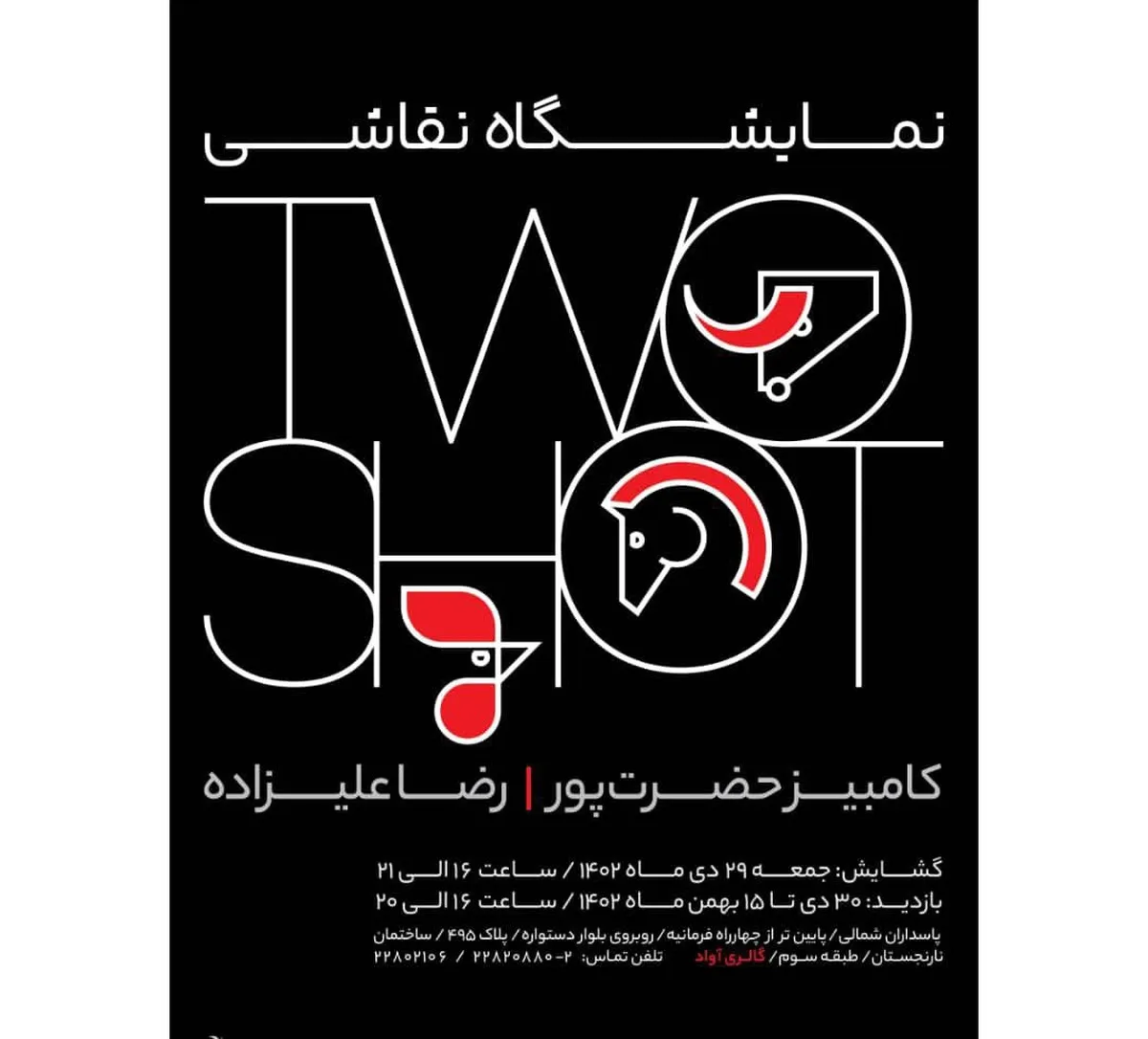 گشایش نمایشگاه نقاشی «دو دیدگاه» (Two shot) جمعه ۲۹ دی ماه ساعت ۱۶ الی ۲۱ خواهد بود و بازدید عمومی از نمایشگاه ۳۰ دی تا ۱۵ بهمن ماه است و علاقمندان میتوانند از این نمایشگاه ساعت ۱۶ الی ۲۰ بازدید کنند. گالری آواد در پاسداران، بالاتر از چهارراه فرمانیه، روبروی بلوار دستواره، پلاک ۴۹۵، ساختمان نارنجستان، طبقه سوم قرار دارد.