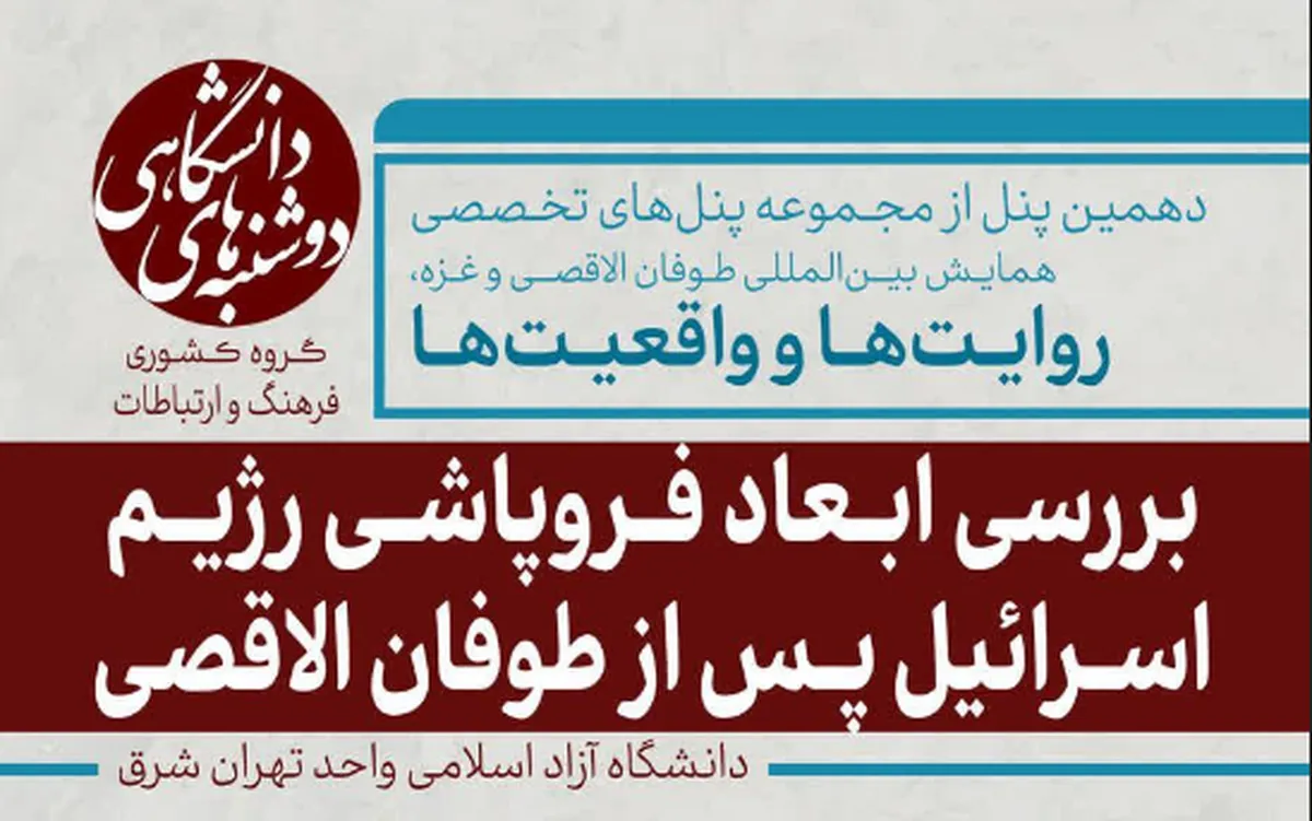 دوشنبههای دانشگاهی دانشگاه آزاد اسلامی، دهمین پنل تخصصی همایش بینالمللی طوفان الاقصی و غزه را با عنوان «بررسی ابعاد فروپاشی رژیم اسرائیل پس از طوفان الاقصی» در واحد تهران شرق برگزار میکند.