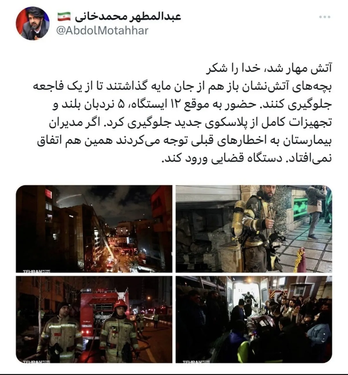 به گزارش خبرنگار فرهنگ و جامعه خبرگزاری علم و فناوری آنا، مطهر محمدخانی سخنگوی شهرداری تهران در صفحه شخصی خود نوشت: آتش مهار شد، خدا را شکر؛ بچههای آتشنشان باز هم از جان مایه گذاشتند تا از یک فاجعه جلوگیری کنند.